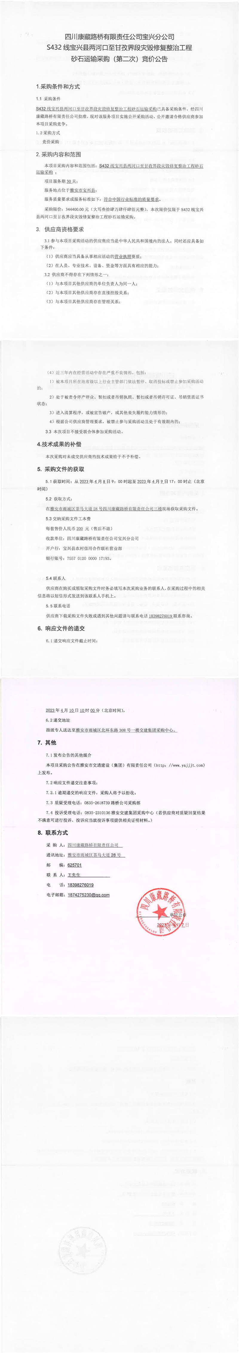 四川康藏路橋有限責(zé)任公司寶興分公司S432寶興縣兩河口至甘孜界段災(zāi)毀修復(fù)整治工程砂石運(yùn)輸采購(第二次)競(jìng)價(jià)公告