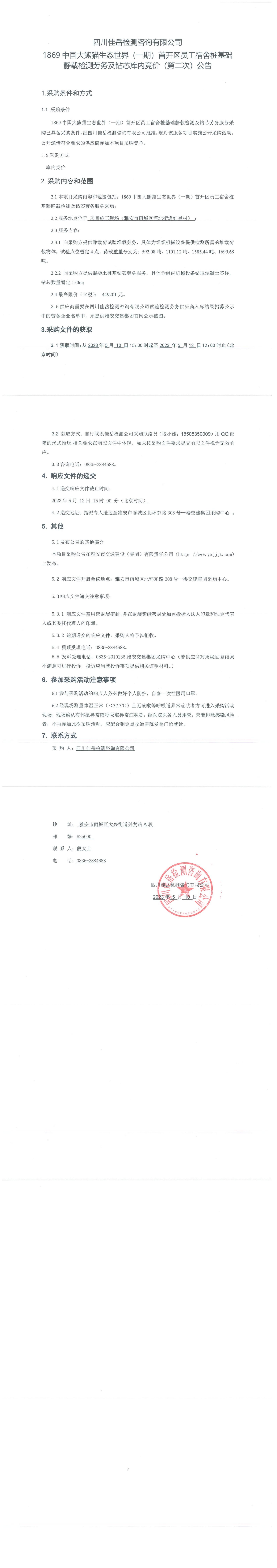 四川佳岳檢測咨詢有限公司1869中國大熊貓生態(tài)世界(一期)首開區(qū)員工宿舍樁基礎靜載檢測勞務及磚芯庫內(nèi)競價(第二次)采購公告