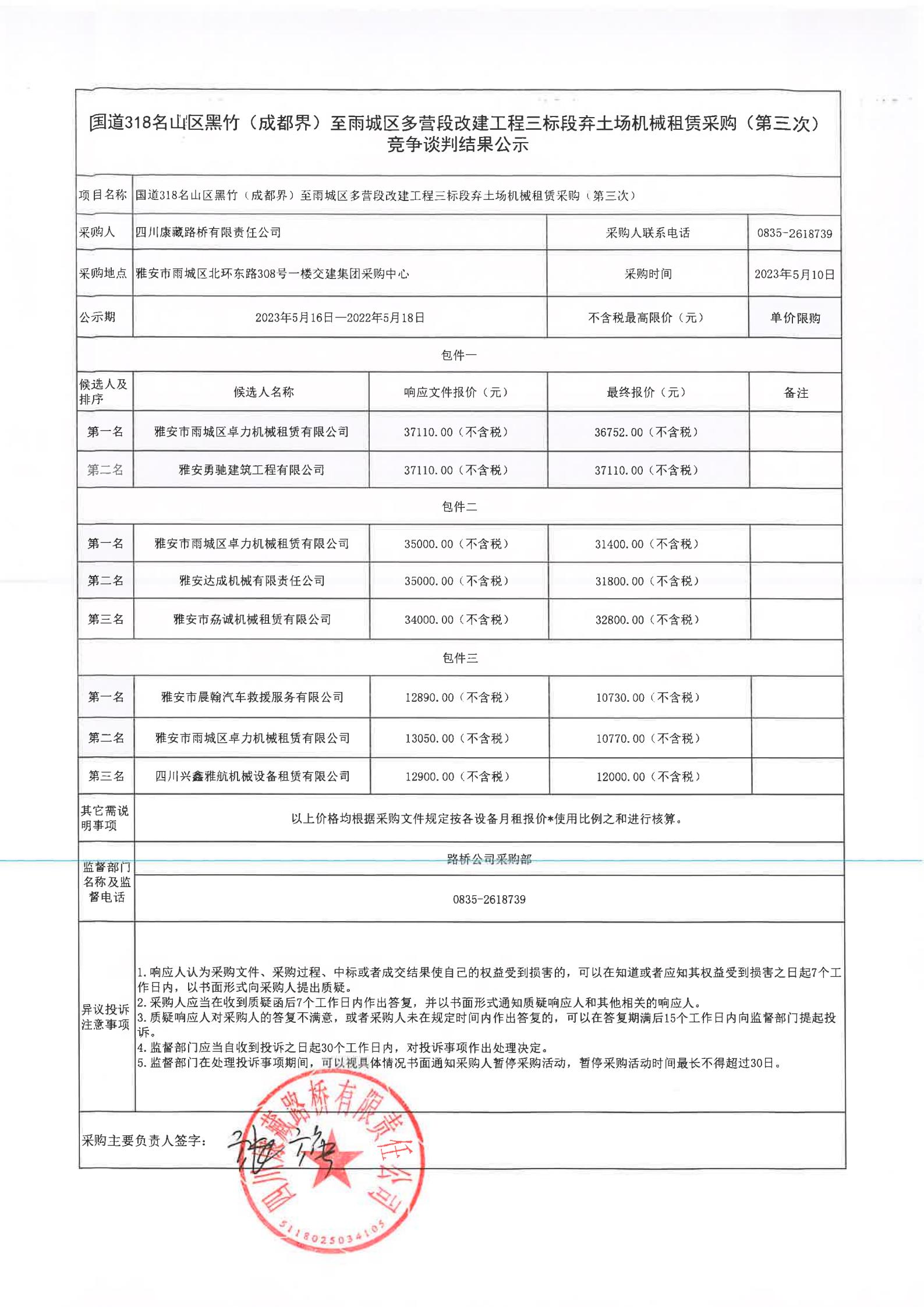 四川康藏路橋有限責(zé)任公司國道318名山區(qū)黑竹(成都界)至雨城區(qū)多營段改建工程三標(biāo)段棄土場(chǎng)機(jī)械租賃采購(第三次)競爭談判結(jié)果公示
