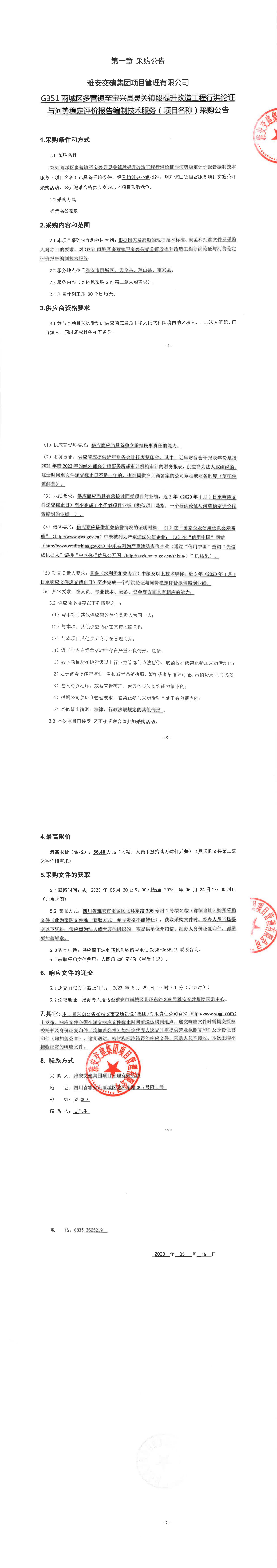 雅安交建集團(tuán)項(xiàng)目管理有限公司G351雨城區(qū)多營鎮(zhèn)至寶興縣靈關(guān)鎮(zhèn)段提升改造工程行洪論證與河勢穩(wěn)定評價(jià)報(bào)告編制技術(shù)服務(wù)(項(xiàng)目名稱)采購公告