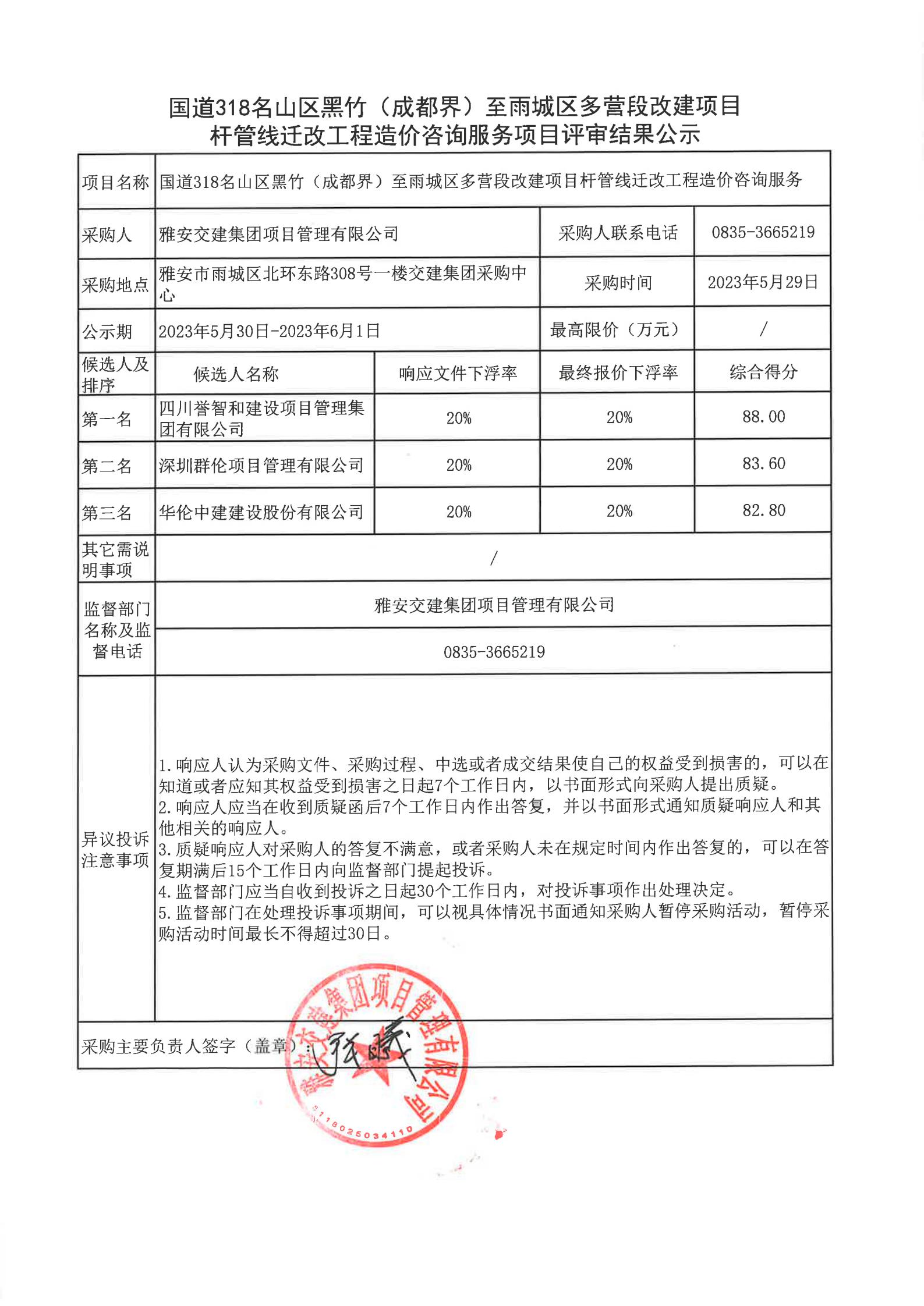 雅安交建集團(tuán)項目管理有限公司國道318名山區(qū)黑竹(成都界)至雨城區(qū)多營段改建項目桿管線遷改工程造價咨詢服務(wù)項目評審結(jié)果公示