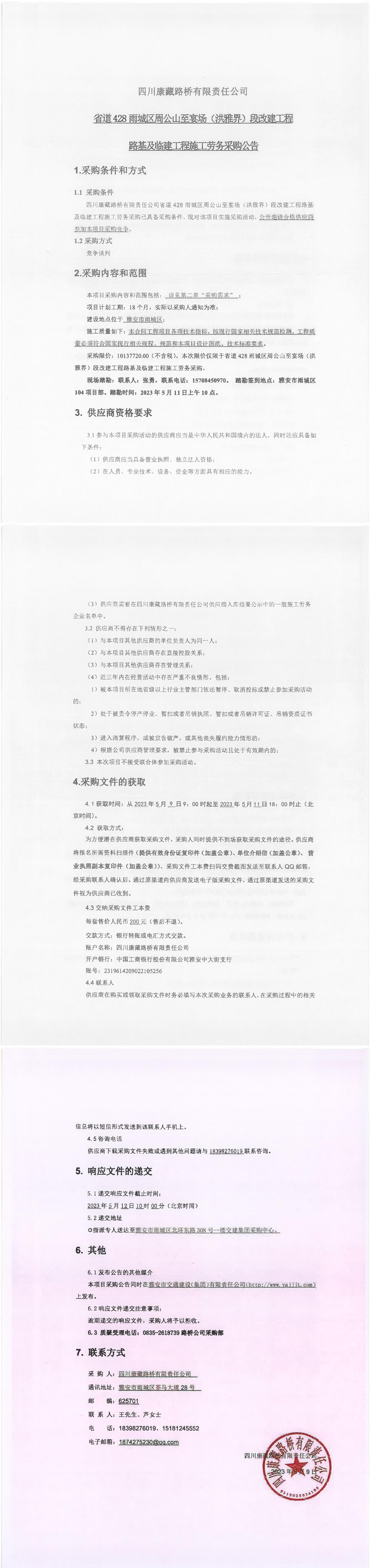 四川康藏路橋有限責任公司省道428雨城區(qū)周公山至宴場(洪雅界)段改建工程路基及臨建工程施工勞務(wù)采購公告