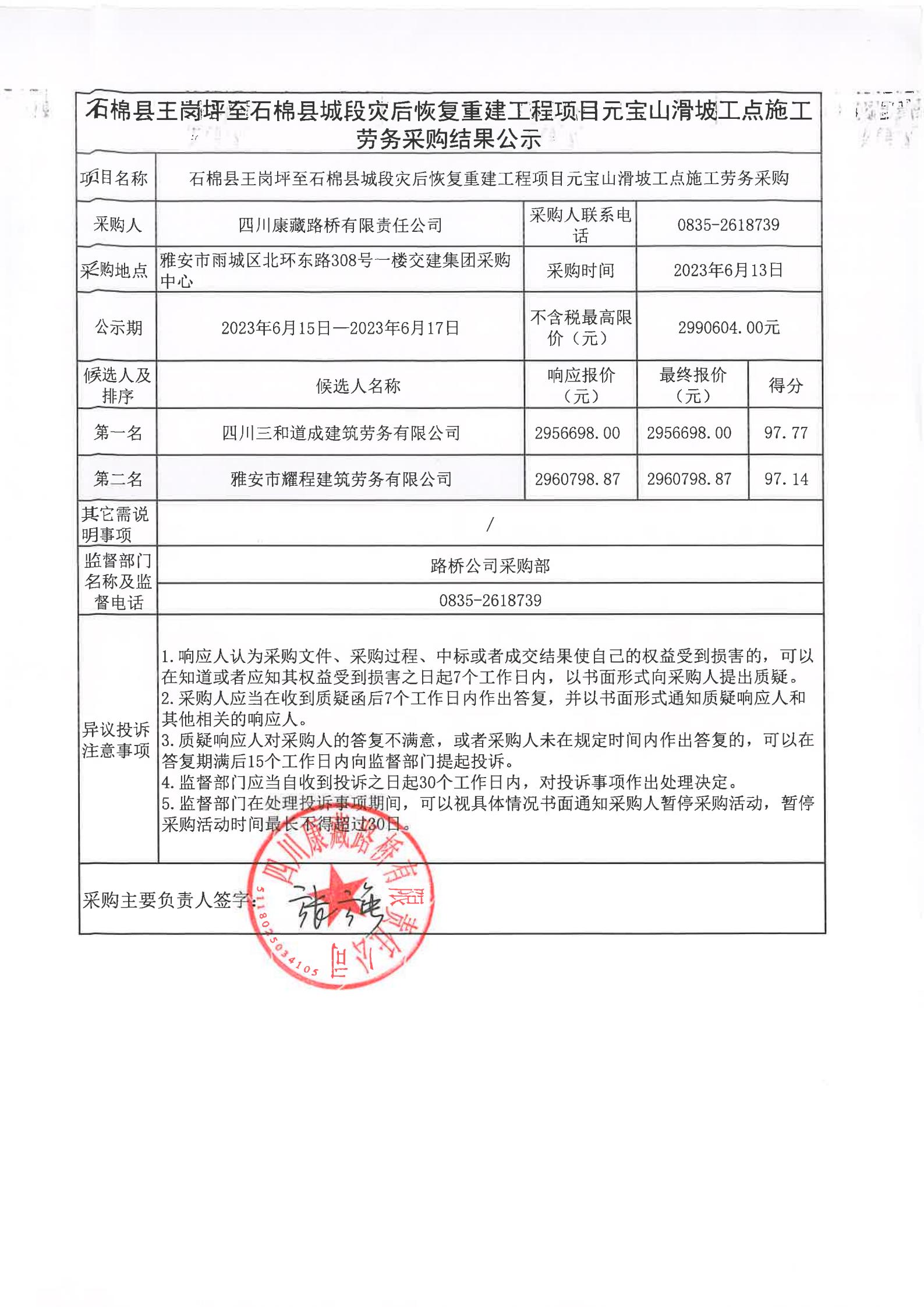 四川康藏路橋有限責任公司石棉縣王崗坪至石棉縣城段災后恢復重建工程項目元寶山滑坡工點施工勞務采購結果公示