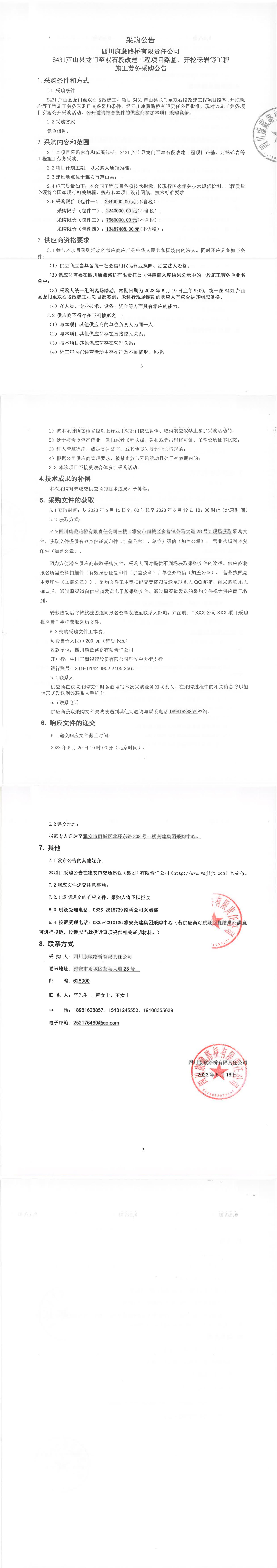 四川康藏路橋有限責(zé)任公司S431蘆山縣龍門至雙石段改建工程項(xiàng)目路基、開挖礫巖等工程施工勞務(wù)采購公告
