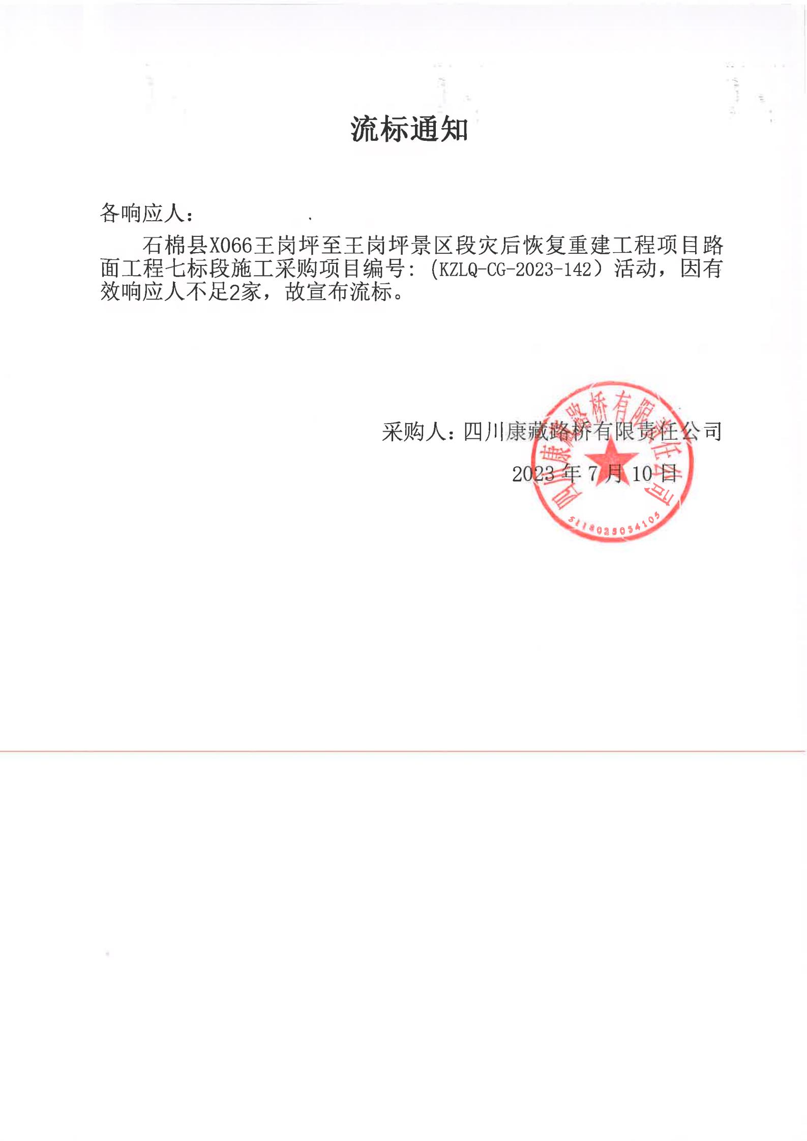 四川康藏路橋有限責任公司石棉縣X066王崗坪至王崗坪景區(qū)段災(zāi)后恢復(fù)重建工程項目路面工程七標段施工采購流標通知