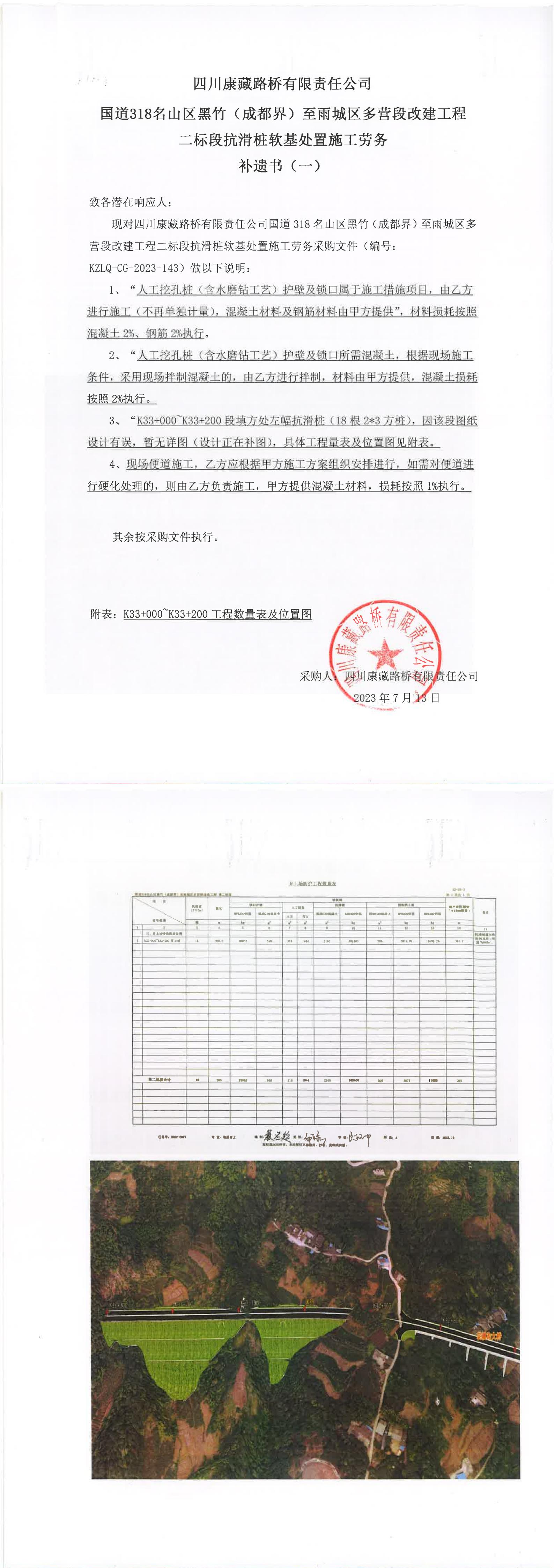 四川康藏路橋有限責任公司國道318名山區(qū)黑竹(成都界)至雨城區(qū)多營段改建工程二標段抗滑樁軟基處置施工勞務(wù)補遺書(一))