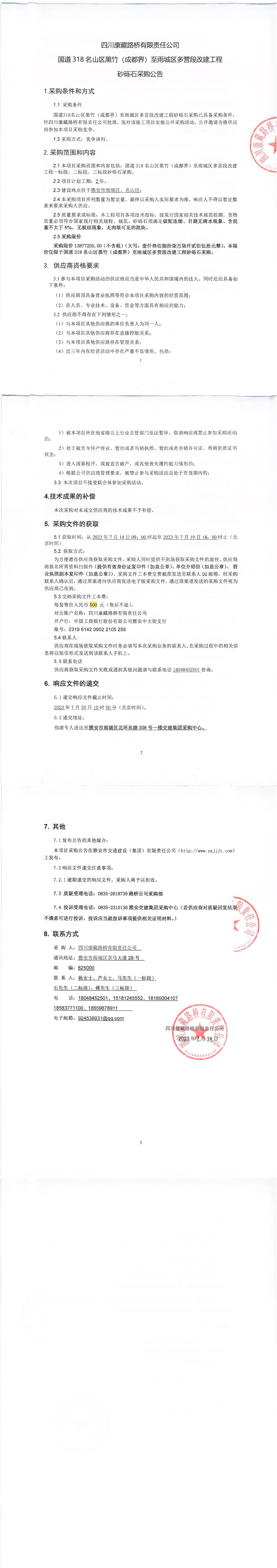 四川康藏路橋有限責(zé)任公司國道318名山區(qū)黑竹(成都界)至雨城區(qū)多營段改建工程砂礫石采購公告