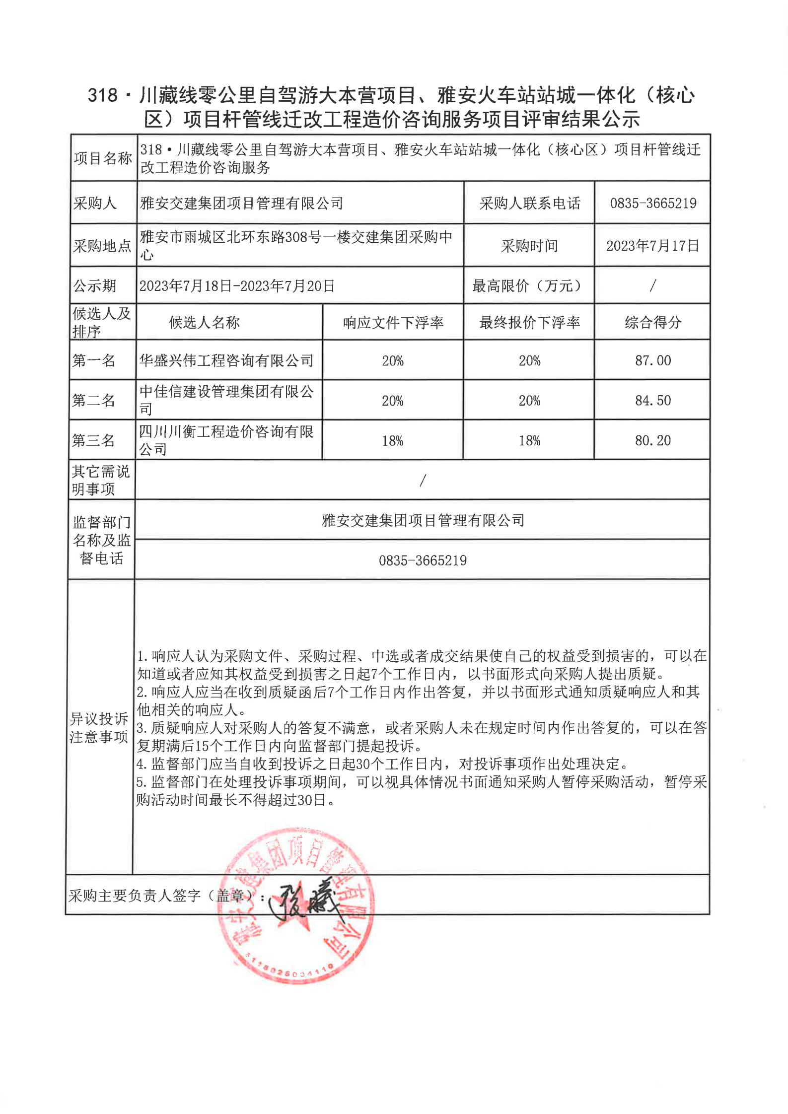雅安交建集團(tuán)項目管理有限公司318·川藏公路零公里自駕游大本營項目、雅安火車站站城一體化(核心區(qū))項目桿管線遷改工程造價咨詢服務(wù)項目評審結(jié)果公示