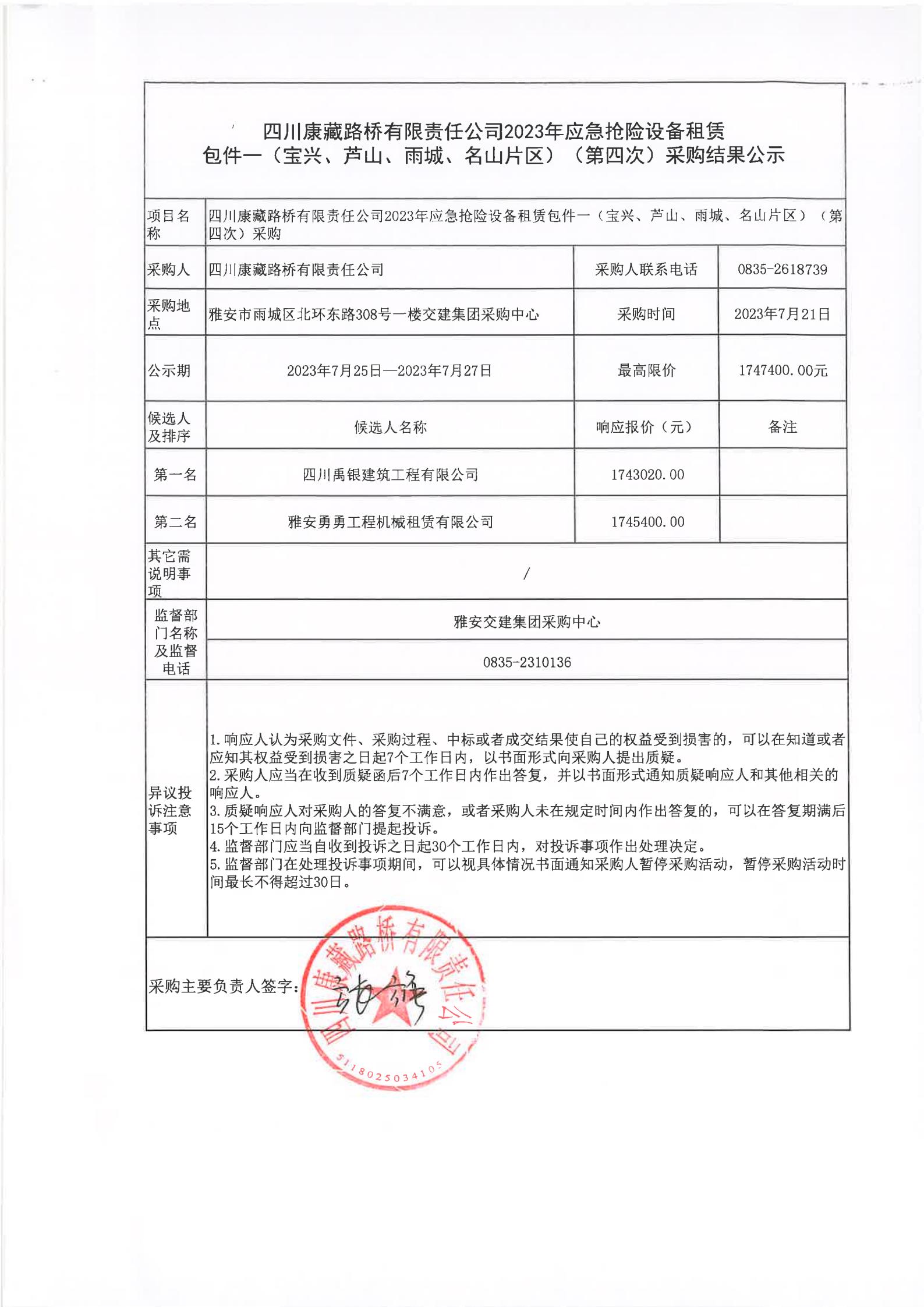 四川康藏路橋有限責任公司2023年應急搶險設備租賃包件一(寶興、蘆山、雨城、名山片區(qū))(第四次)采購結(jié)果公示