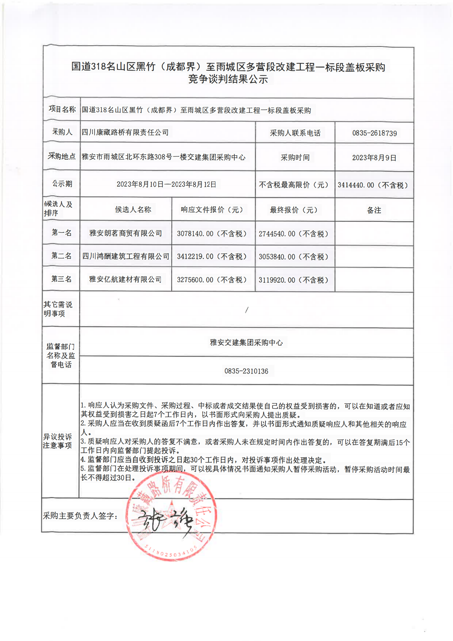 四川康藏路橋有限責任公司國道318名山區(qū)黑竹(成都界)至雨城區(qū)多營段改建工程一標段蓋板采購競爭談判結果公示