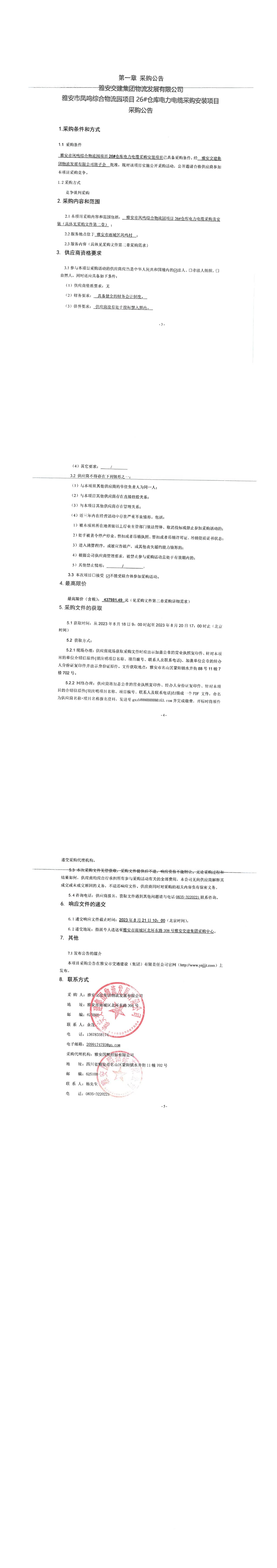 雅安交建集團物流發(fā)展有限公司雅安市鳳鳴綜合物流園項目26#倉庫電力電纜采購安裝項目采購公告