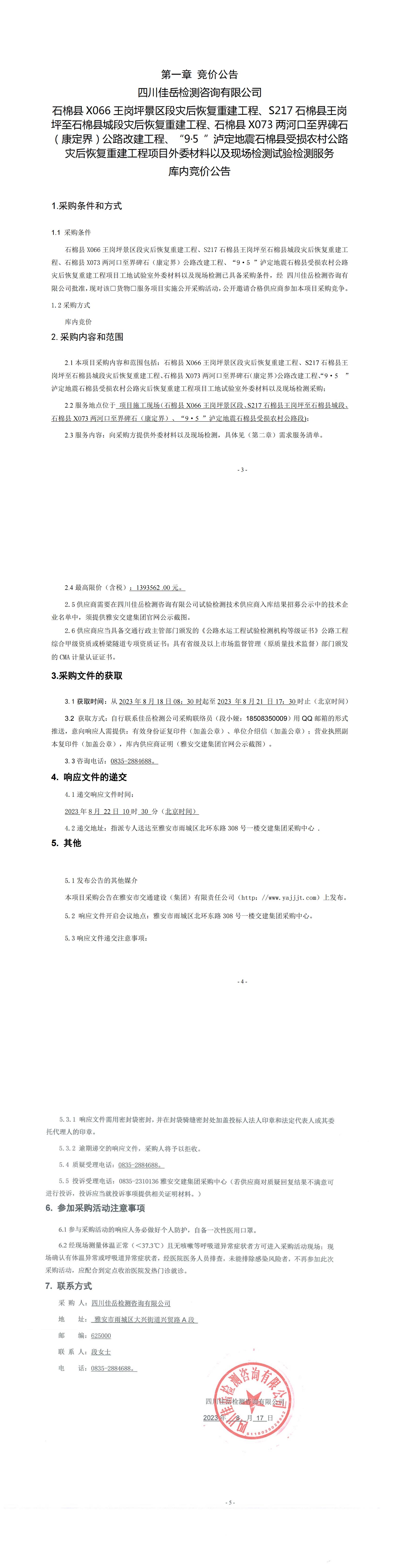 四川佳岳檢測(cè)咨詢(xún)有限公司石棉縣X066王崗坪至王崗坪景區(qū)段災(zāi)后恢復(fù)重建工程、S217石棉縣王崗坪至石棉縣城段災(zāi)后恢復(fù)重建工程、石棉縣X073兩河口至界碑石(康定界)公路改建工程、“9·5”瀘定地震石棉縣受損農(nóng)村公路災(zāi)后恢復(fù)重建工程項(xiàng)目外委材料以及現(xiàn)場(chǎng)檢測(cè)試驗(yàn)檢測(cè)服務(wù)庫(kù)內(nèi)競(jìng)價(jià)公告