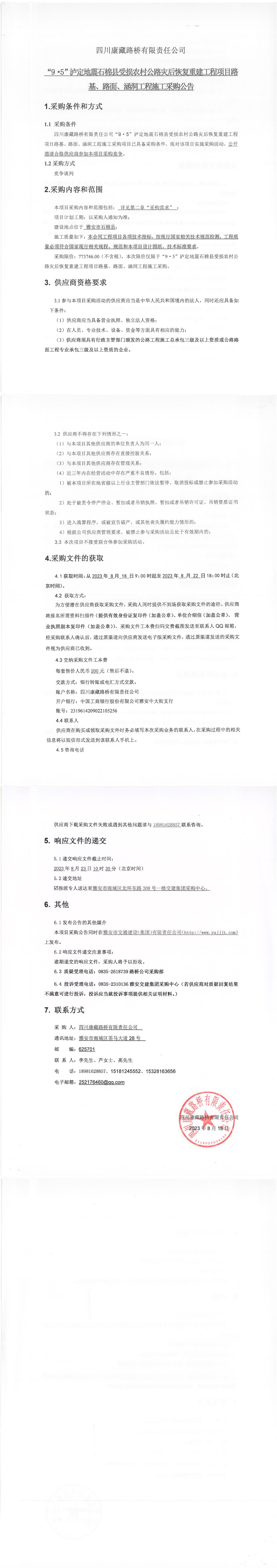 四川康藏路橋有限責任公司“9·5”瀘定地震石棉縣受損農村公路災后恢復重建工程項目路基、路面、涵洞工程施工采購公告