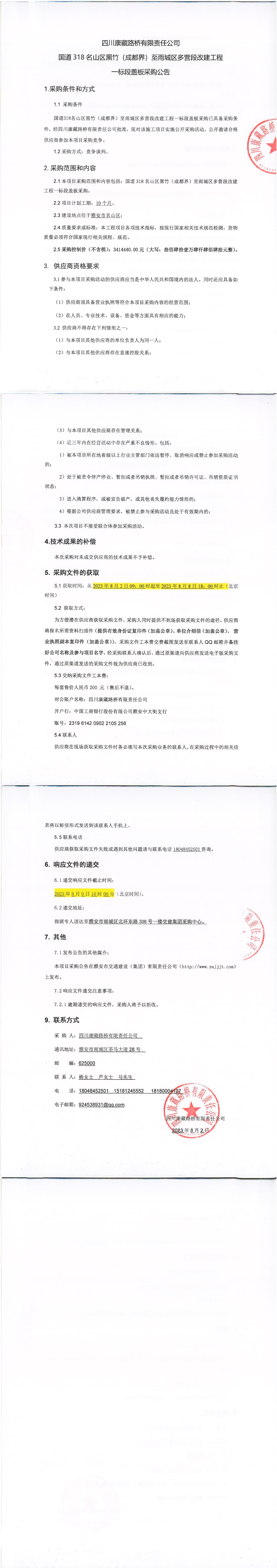 四川康藏路橋有限責(zé)任公司國(guó)道318名山區(qū)黑竹(成都界)至雨城區(qū)多營(yíng)段改建工程一標(biāo)段蓋板采購(gòu)公告