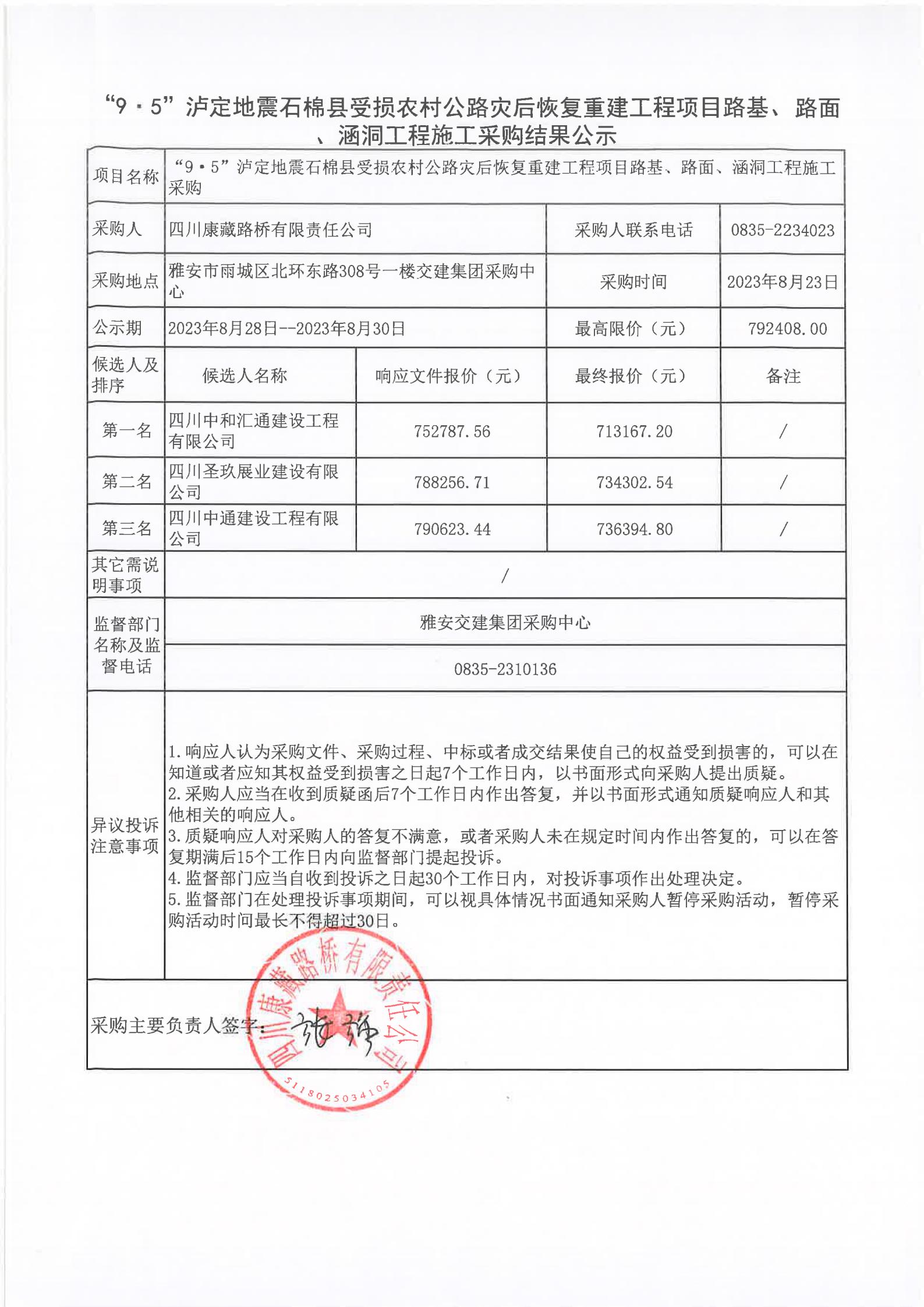 四川康藏路橋有限責任公司“9·5”瀘定地震石棉縣受損農(nóng)村公路災后恢復重建工程項目路基、路面、涵洞工程施工采購結果公示