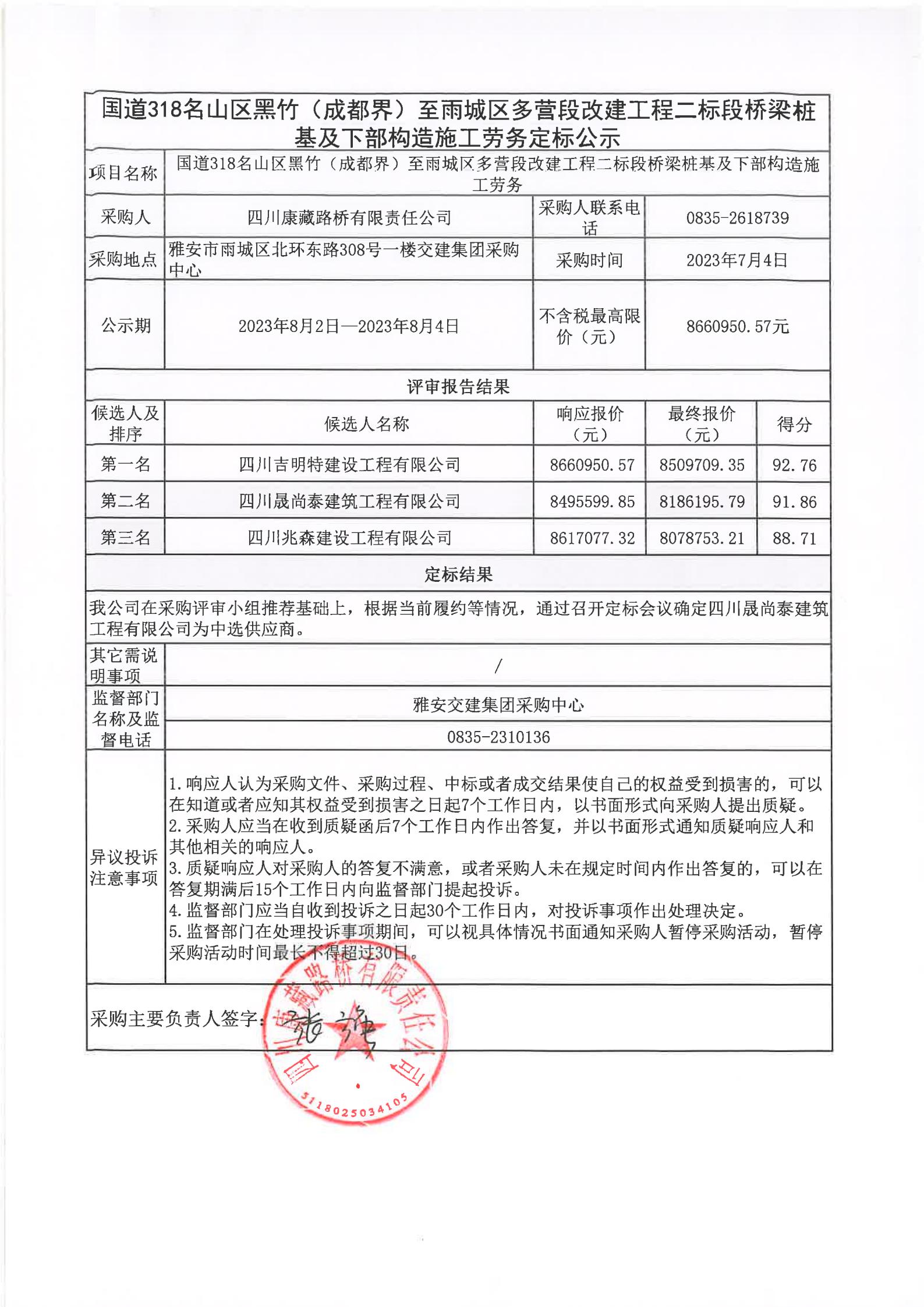 四川康藏路橋有限責任公司國道318名山區(qū)黑竹(成都界)至雨城區(qū)多營段改建工程二標段橋梁樁基及下部構造施工勞務定標公示