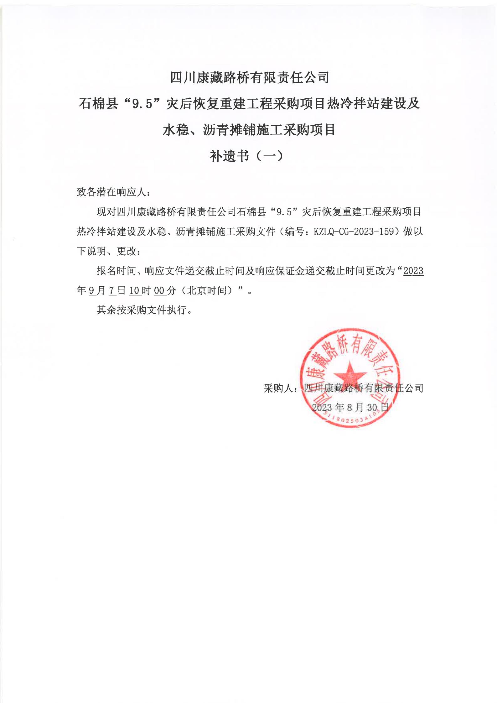 四川康藏路橋有限責(zé)任公司石棉縣“9·5”災(zāi)后恢復(fù)重建工程采購項(xiàng)目熱冷拌站建設(shè)及水穩(wěn)、瀝青攤鋪施工采購項(xiàng)目補(bǔ)遺書(一)