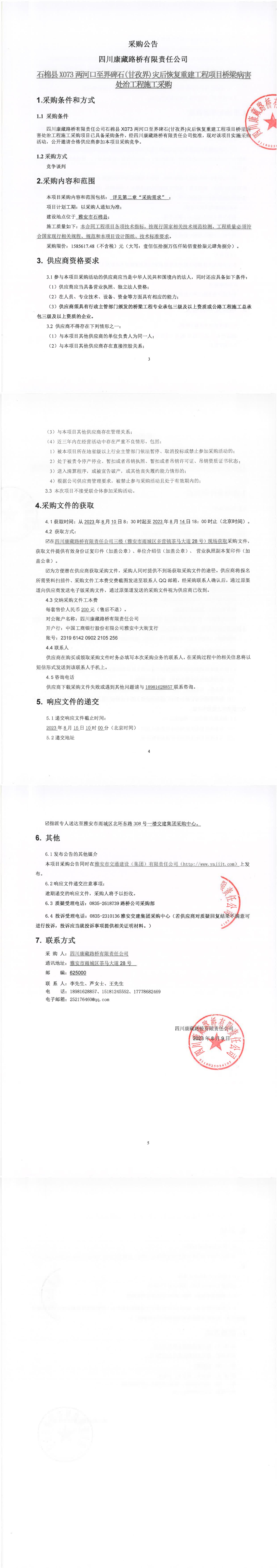 四川康藏路橋有限責任公司石棉縣X073兩河口至界碑石(甘孜界)災后恢復重建工程項目橋梁病害處治工程施工采購