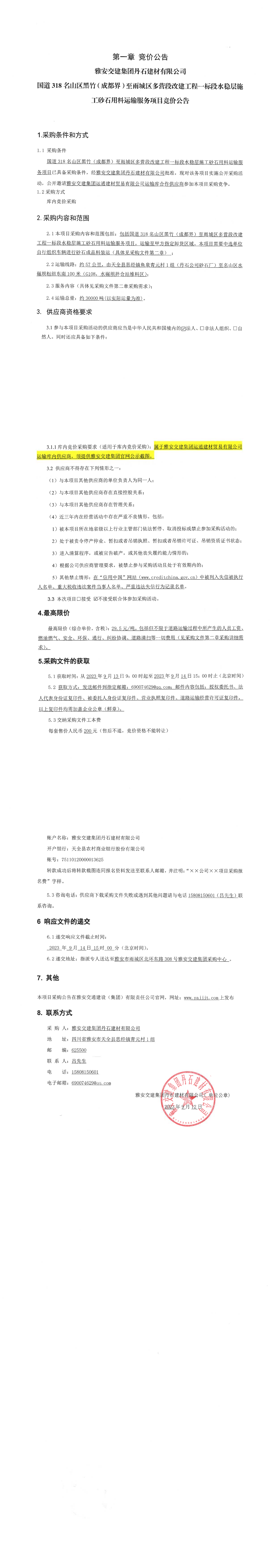 雅安交建集團丹石建材有限公司國道318名山區(qū)黑竹(成都界)至雨城區(qū)多營段改建工程一標段水穩(wěn)層施工砂石用料運輸服務項目競價公告