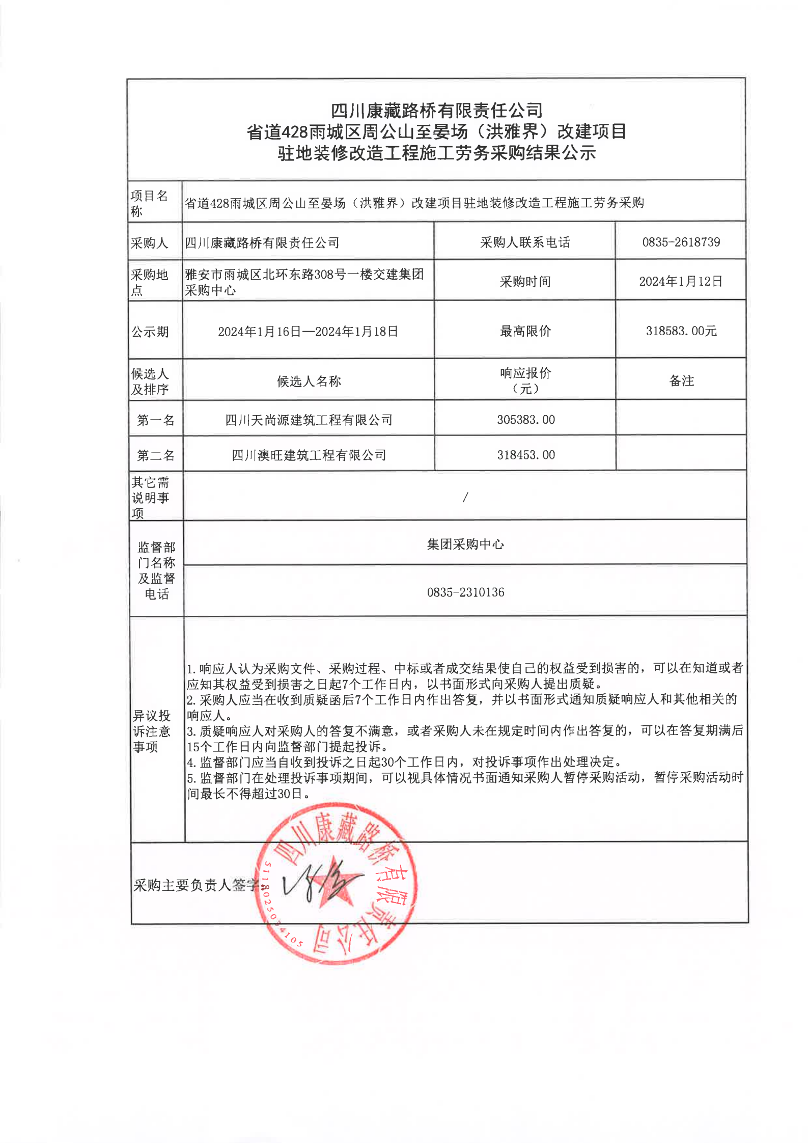 四川康藏路橋有限責(zé)任公司省道428雨城區(qū)周公山至晏場(洪雅界)改建項目駐地裝修改造工程施工勞務(wù)采購結(jié)果公示