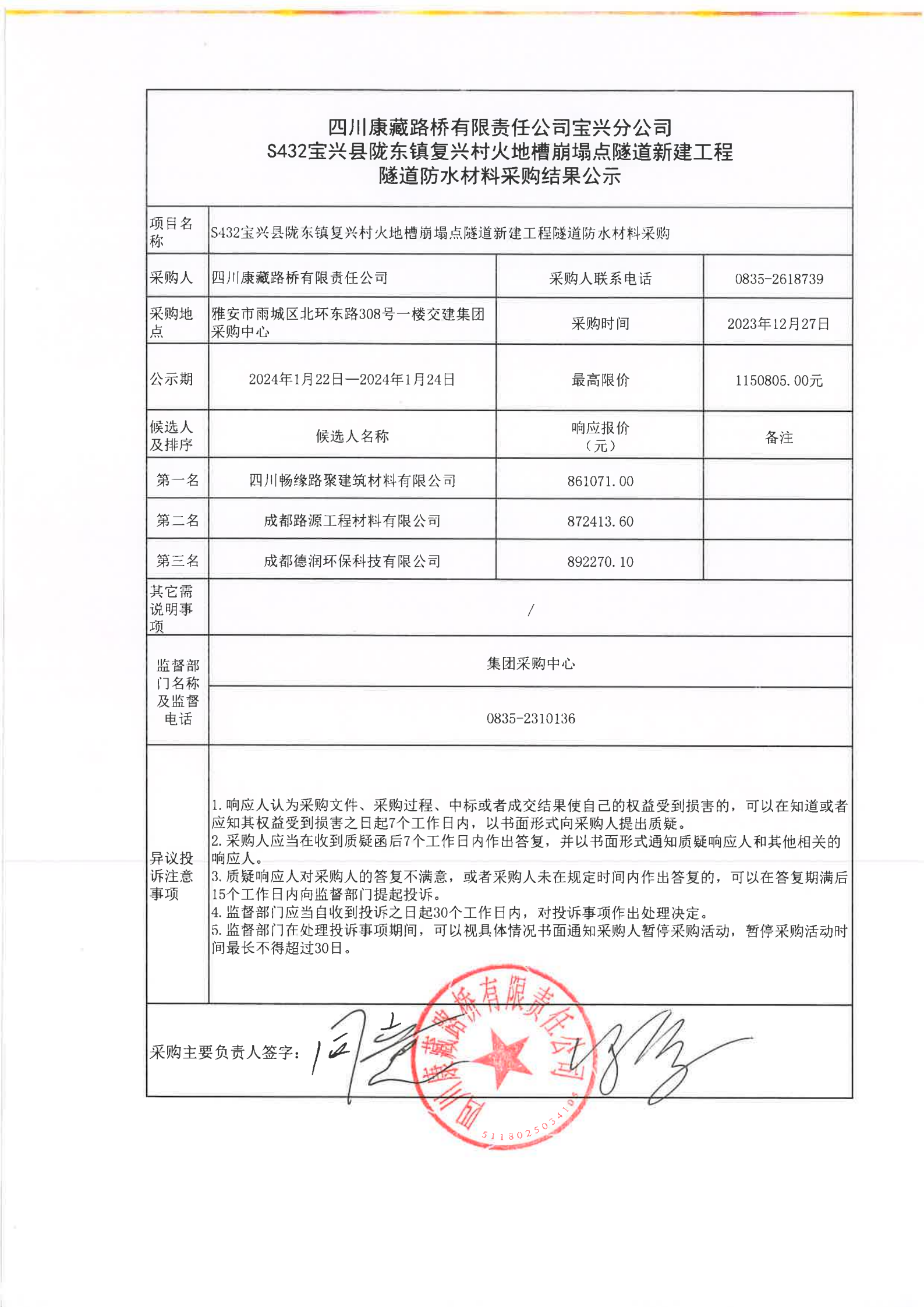 四川康藏路橋有限責任公司寶興分公司S432寶興縣隴東鎮(zhèn)復興村火地槽崩塌點隧道新建工程隧道防水材料采購結果公示