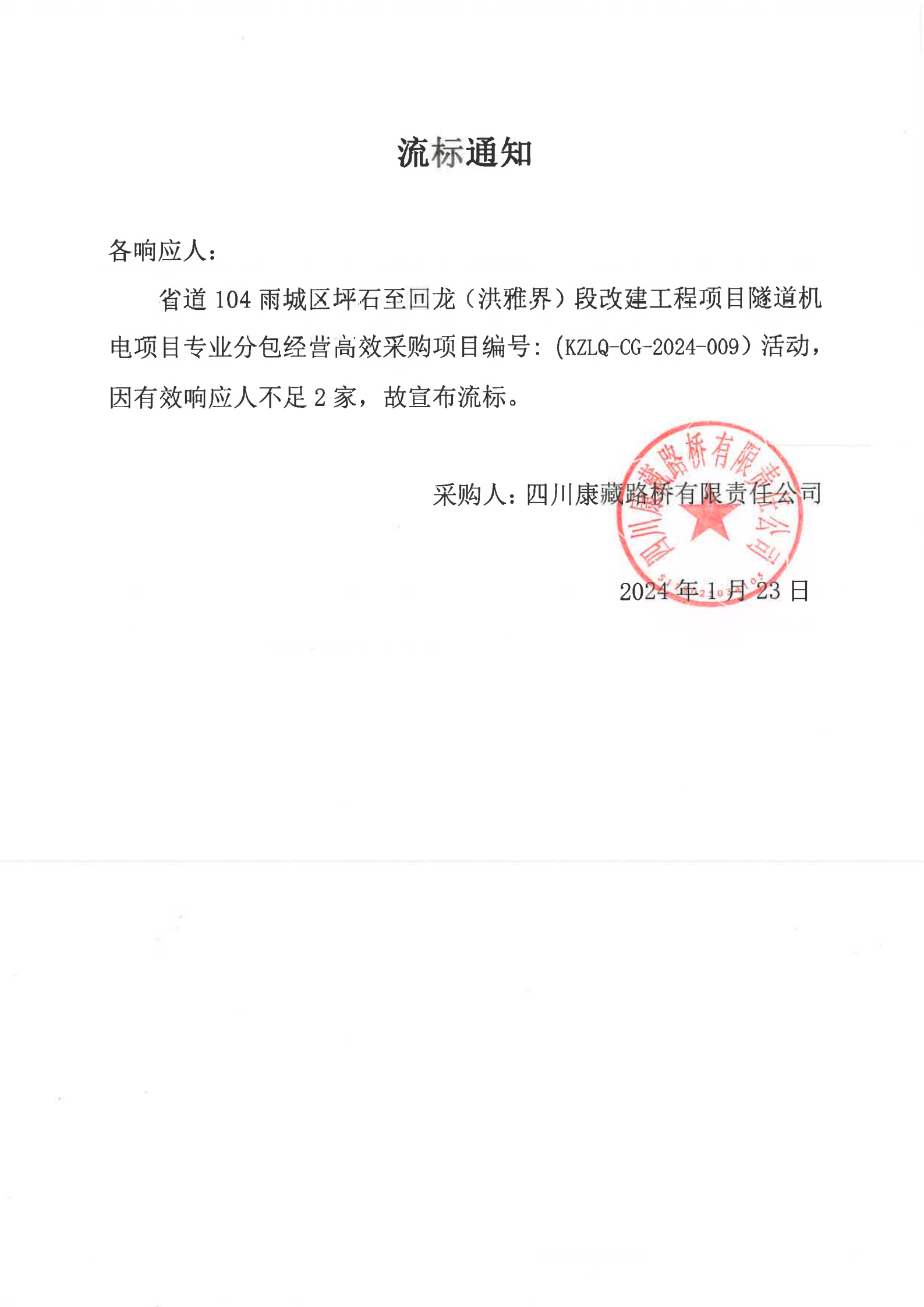 四川康藏路橋有限責任公司國道318名山區(qū)黑竹(成都界)至雨城區(qū)多營段改建工程二標段安全物資(五金類)采購流標通知