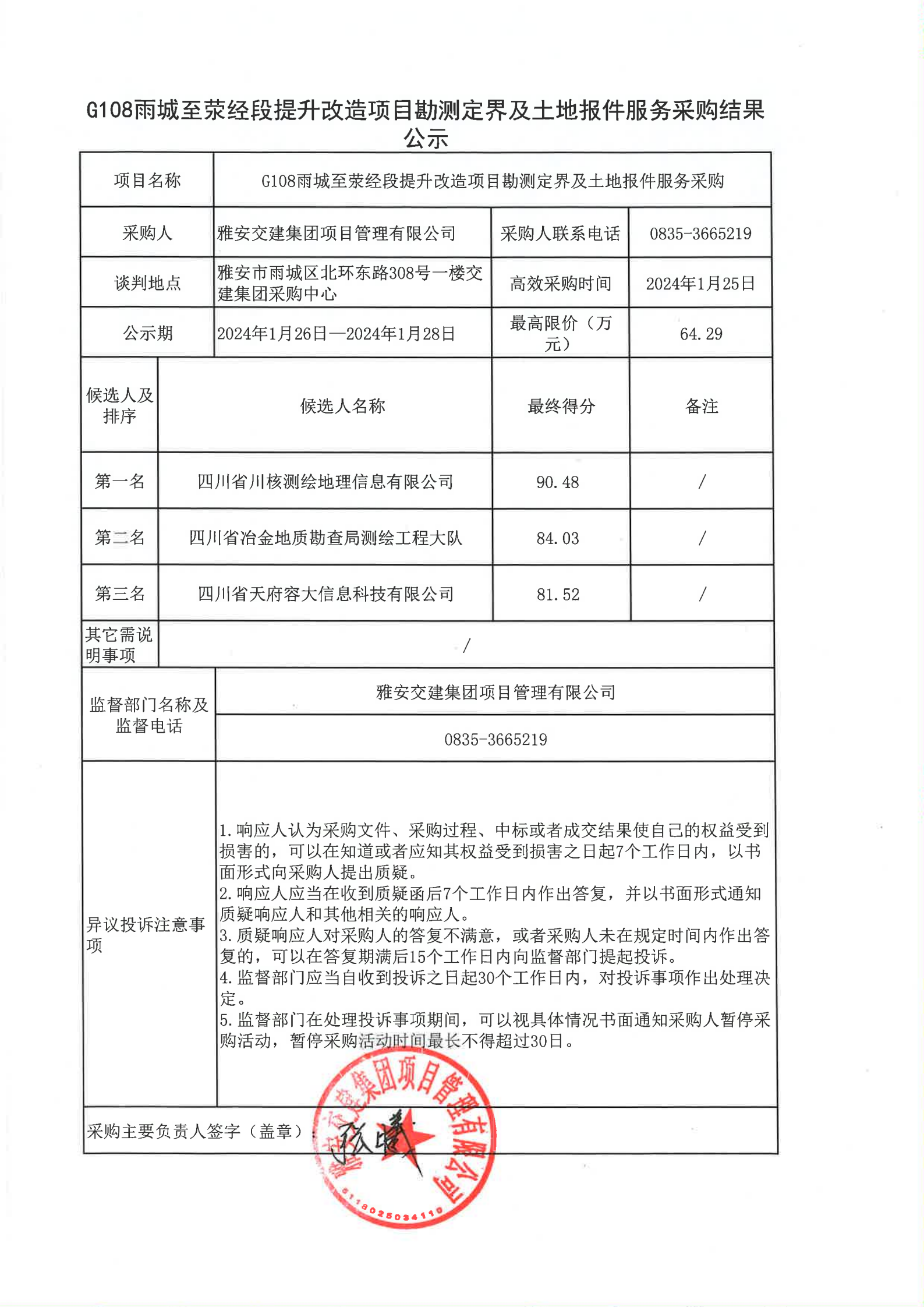 四川康藏路橋有限責(zé)任公司G108雨城至滎經(jīng)段提升改造項(xiàng)目勘測(cè)定界及土地報(bào)件服務(wù)采購結(jié)果公示