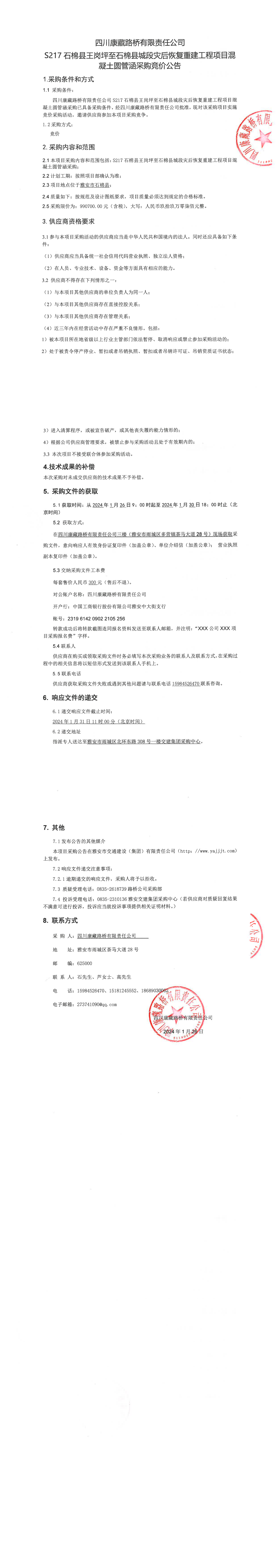 四川康藏路橋有限責(zé)任公司S217石棉縣王崗坪至石棉縣城段災(zāi)后恢復(fù)重建工程項目混凝土圓管涵采購競價公告