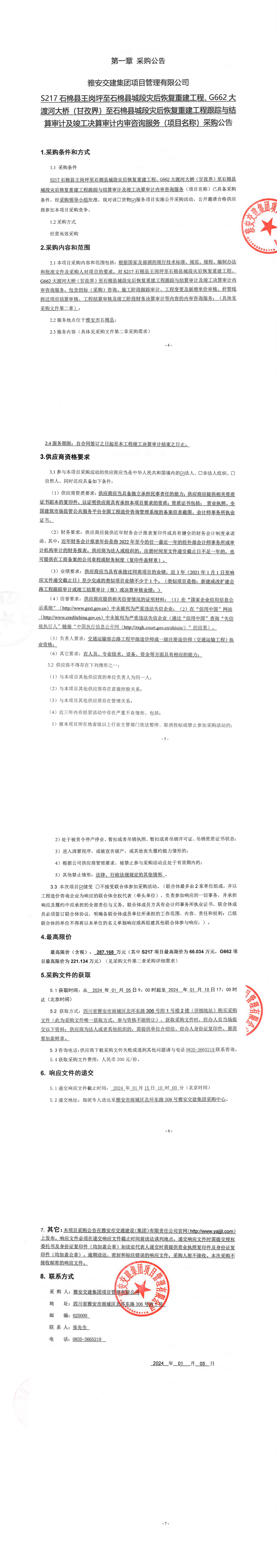 雅安交建集團項目管理有限公司S217石棉縣王崗坪至石棉縣城段災后恢復重建工程、G662大渡河大橋(甘孜界)至石棉縣城段災后恢復重建工程跟蹤與結算審計及竣工決算審計內審咨詢服務(項目名稱)采購公告
