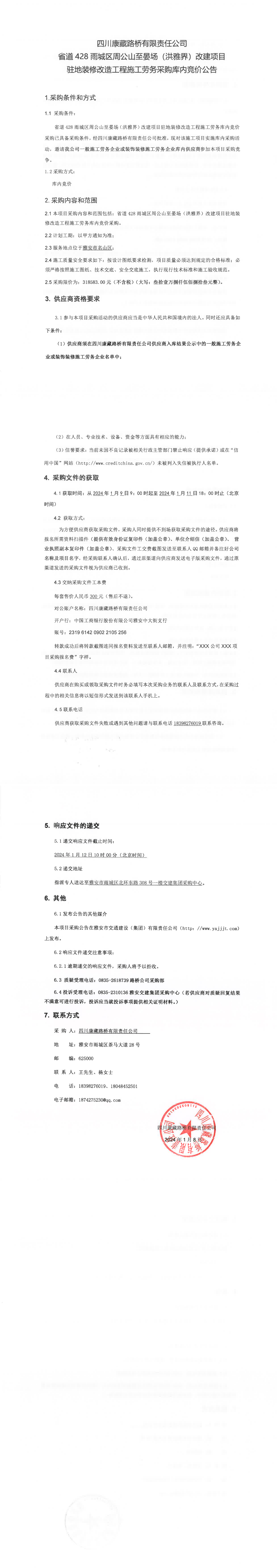 四川康藏路橋有限責(zé)任公司省道428雨城區(qū)周公山至晏場(chǎng)(洪雅界)改建項(xiàng)目駐地裝修改造工程施工勞務(wù)采購庫內(nèi)競(jìng)價(jià)公告