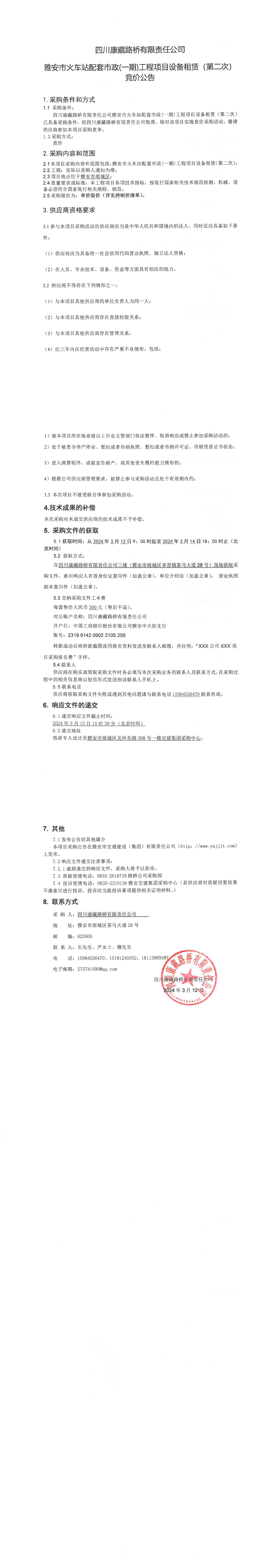 四川康藏路橋有限責(zé)任公司雅安市火車站配套市政(一期)工程項(xiàng)目設(shè)備租賃(第二次)競價(jià)公告