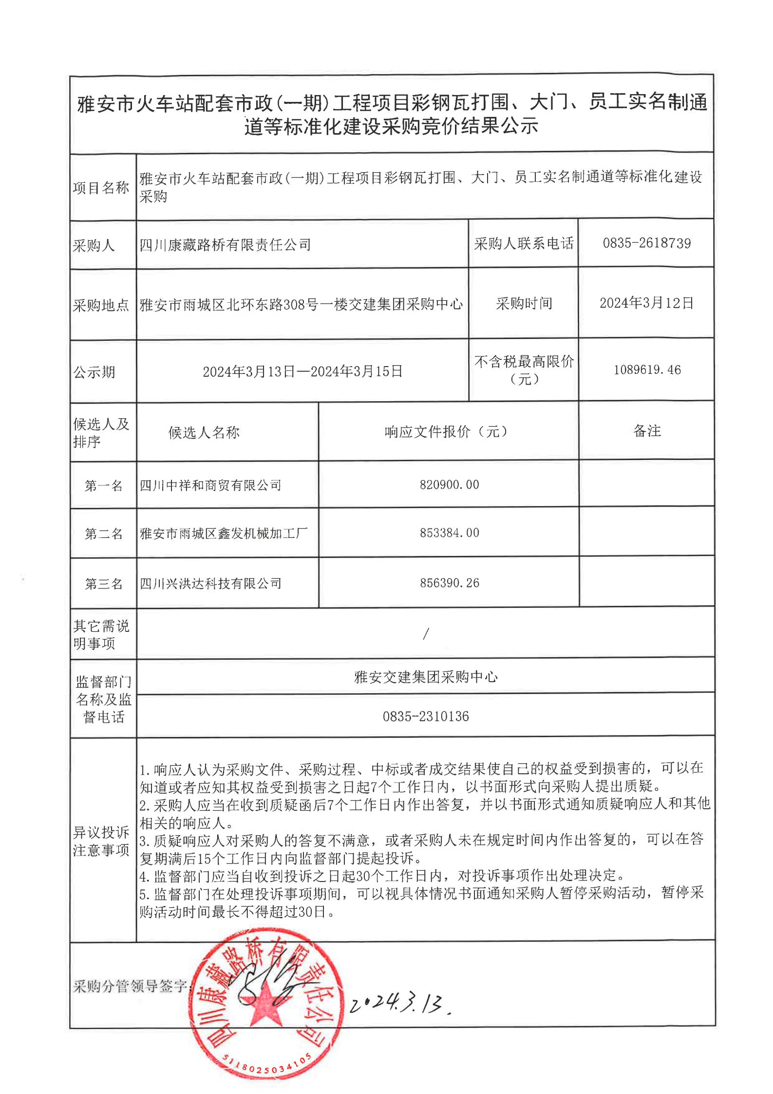 四川康藏路橋有限責(zé)任公司雅安市火車站配套市政(一期)工程項(xiàng)目彩鋼瓦打圍、大門、員工實(shí)名制通道等標(biāo)準(zhǔn)化建設(shè)采購結(jié)果公示