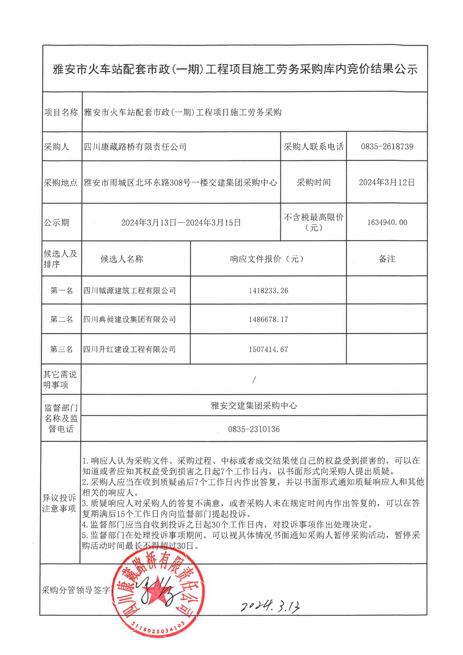四川康藏路橋有限責(zé)任公司雅安市火車站配套市政(一期)工程項(xiàng)目施工勞務(wù)采購結(jié)果公示
