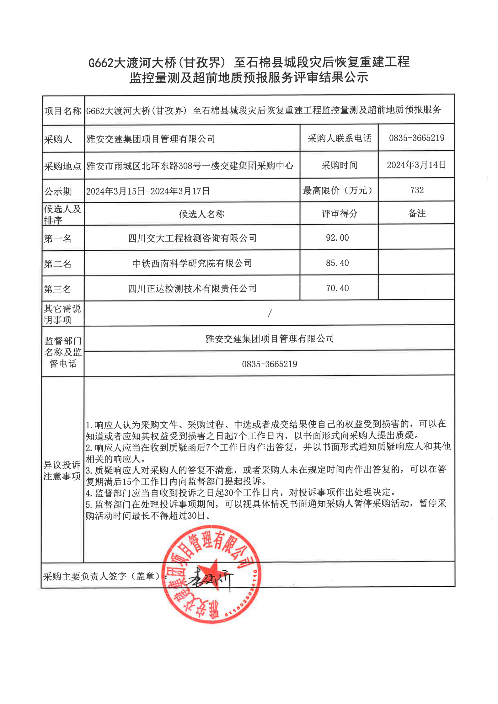 雅安交建集團(tuán)項(xiàng)目管理有限公司G662大渡河大橋(甘孜界)至石棉縣城段災(zāi)后恢復(fù)重建工程監(jiān)控量測(cè)及超前地質(zhì)預(yù)報(bào)服務(wù)評(píng)審結(jié)果公示