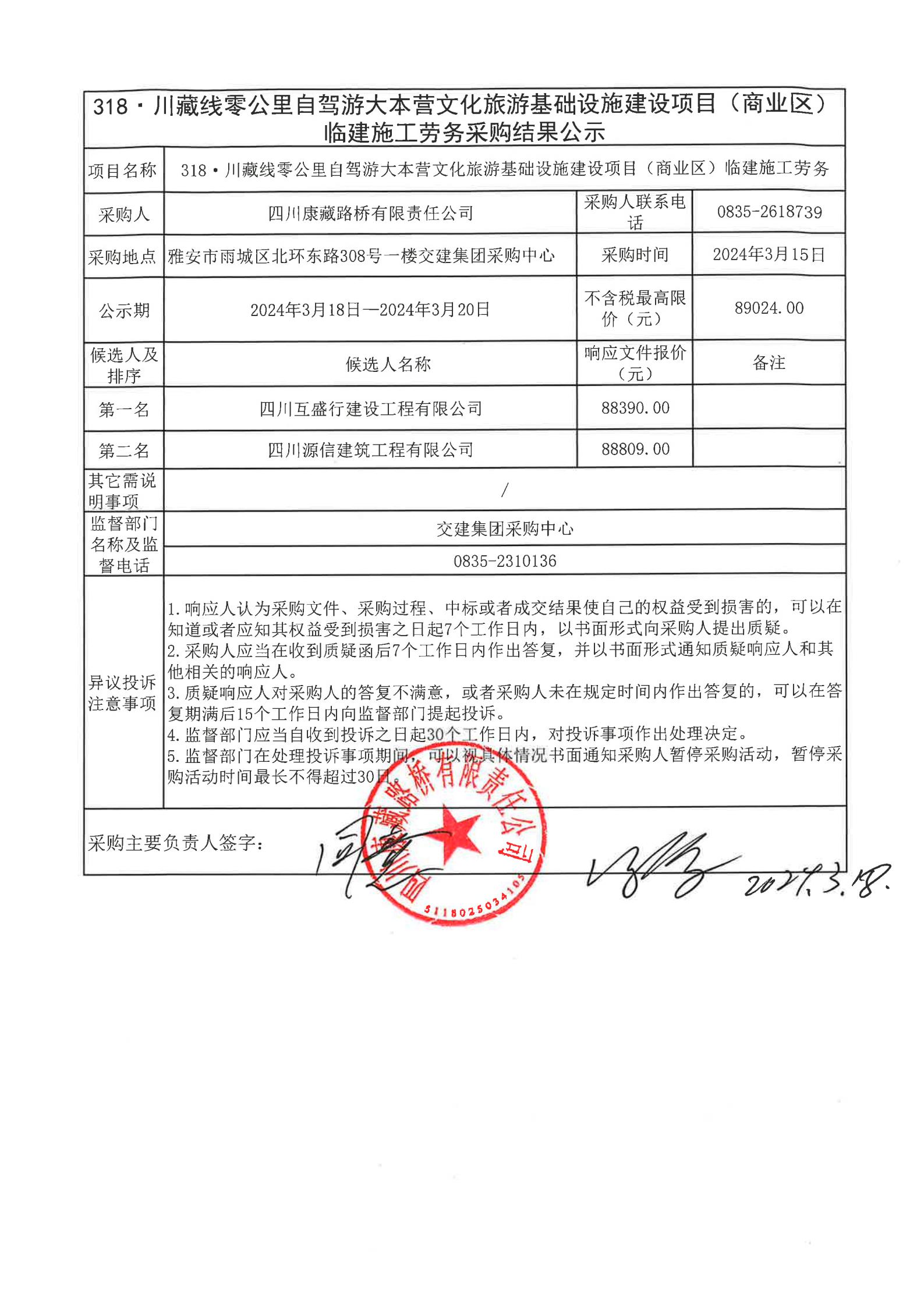 四川康藏路橋有限責(zé)任公司318·川藏線零公里自駕游大本營文化旅游基礎(chǔ)設(shè)施建設(shè)項目(商業(yè)區(qū))臨建施工勞務(wù)結(jié)果公示