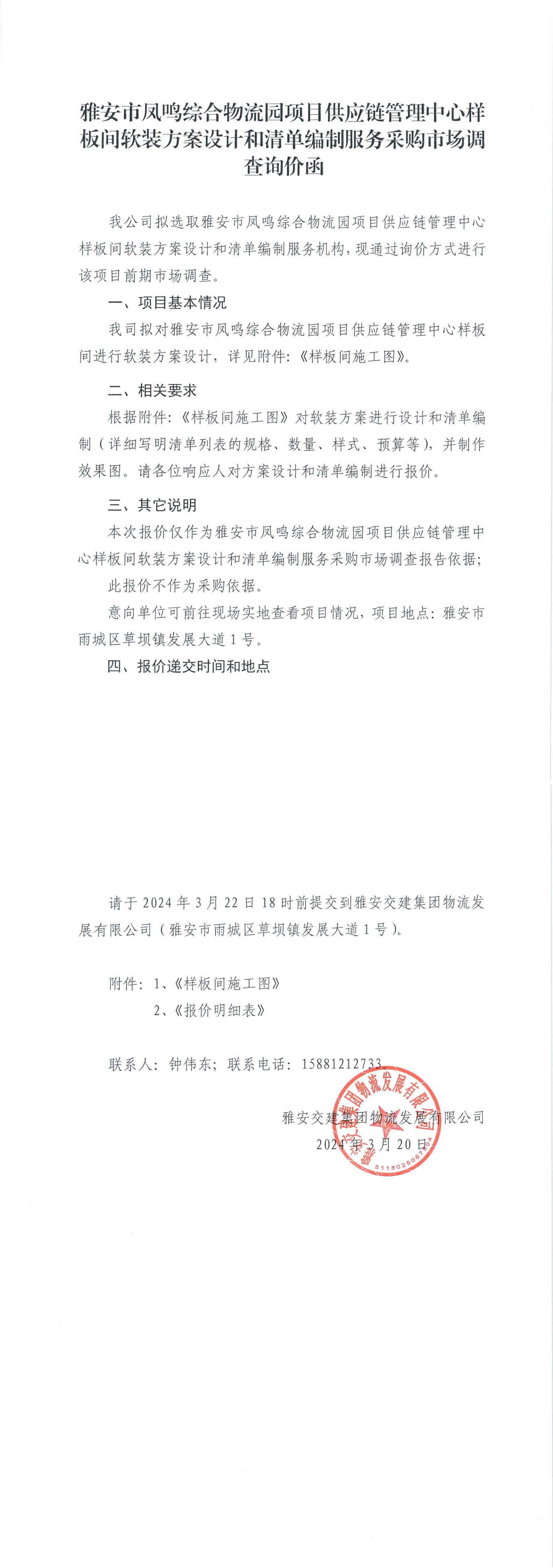 雅安交建集團物流發(fā)展有限公司雅安市鳳鳴綜合物流園項目供應(yīng)鏈管理中心樣板間軟裝方案設(shè)計和清單編制服務(wù)采購市場調(diào)查詢價函