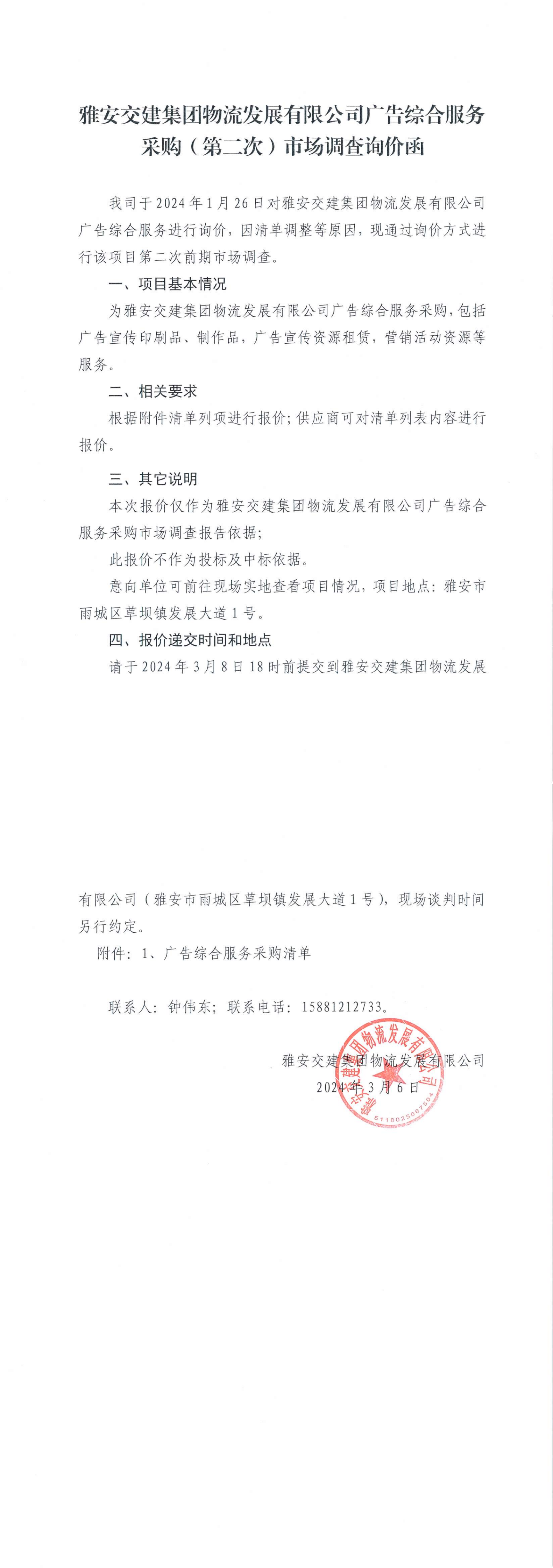 雅安交建集團物流發(fā)展有限公司廣告綜合服務采購(第二次)市場調(diào)查詢價函