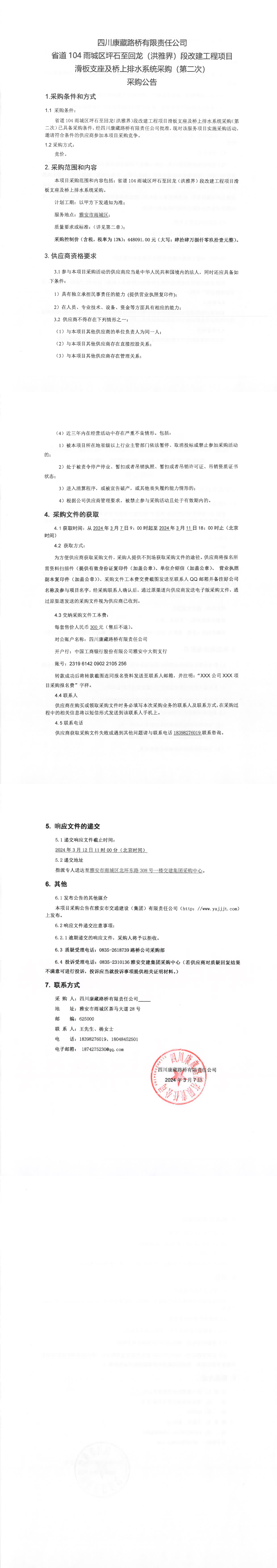 四川康藏路橋有限責(zé)任公司省道104雨城區(qū)坪石至回龍(洪雅界)段改建工程項目滑板支座及橋上排水系統(tǒng)流采購標(biāo)通知