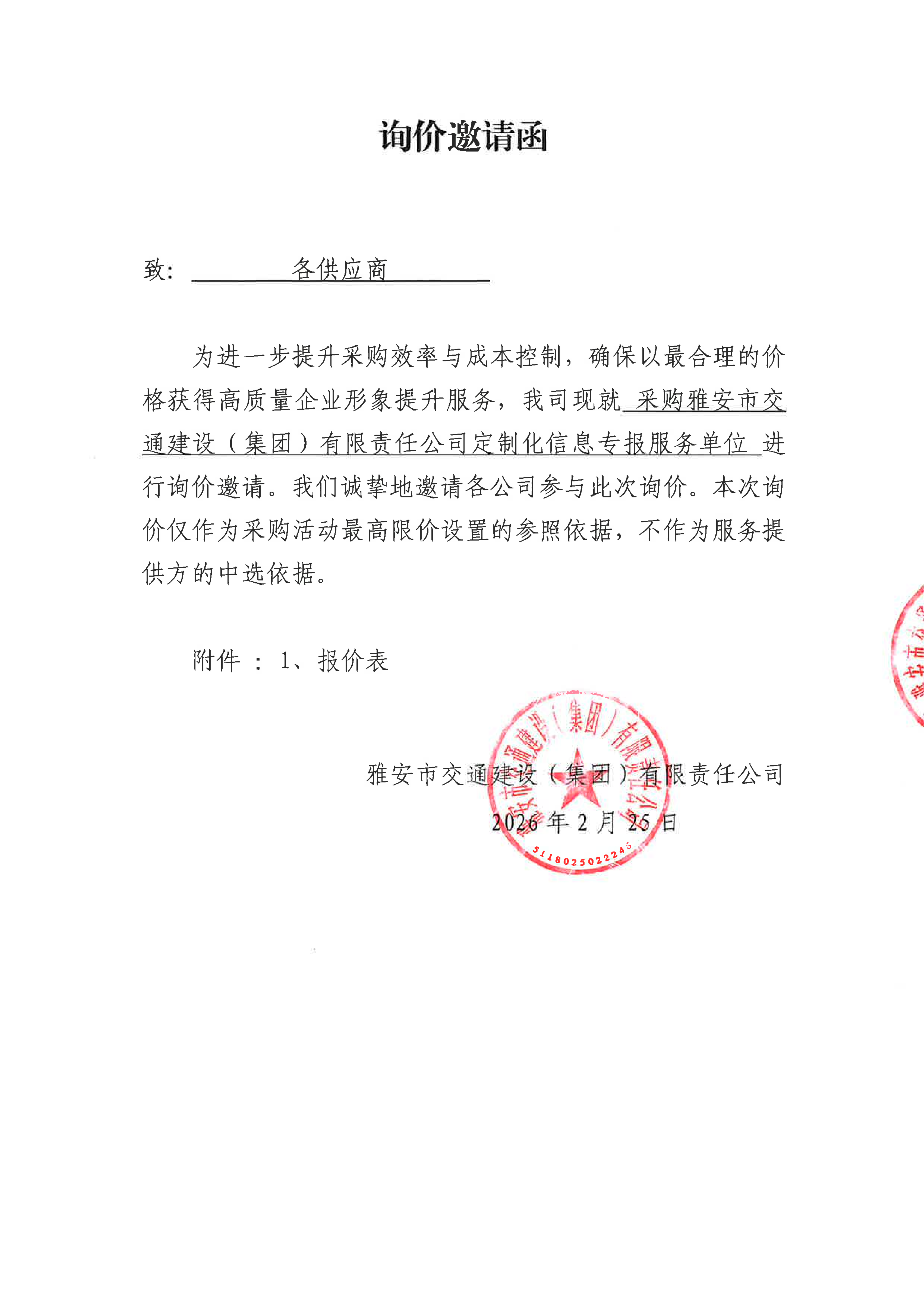 關(guān)于雅安市交通建設(shè)(集團(tuán))有限責(zé)任公司定制化信息專報(bào)服務(wù)采購限價(jià)的詢價(jià)函