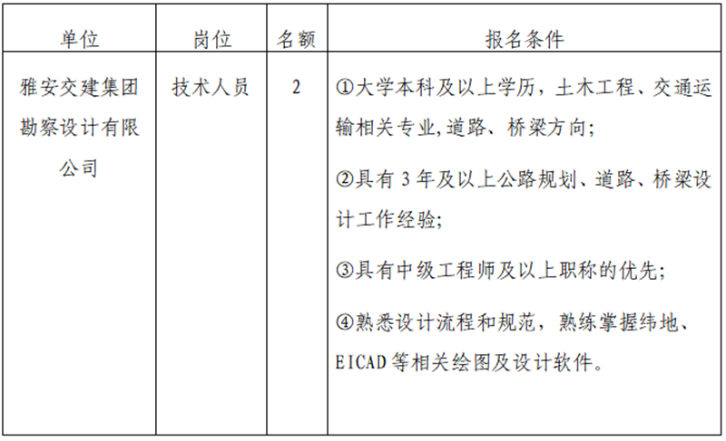 根據(jù)發(fā)展需要,決定面向社會公開招聘雅安市交通建設(shè)(集團)有限責(zé)任公司(以下簡稱“雅安交建集團”)所屬子公司工作人員2名,現(xiàn)將有關(guān)事項公告如下: