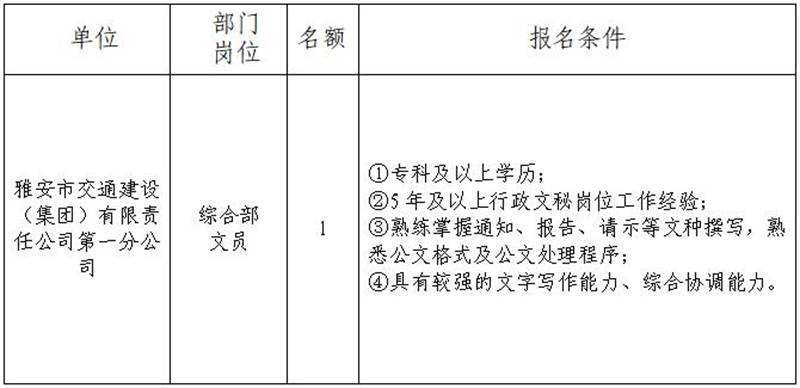 雅安交建集團(tuán)關(guān)于公開招聘所屬分公司工作人員的公告(第一分公司)