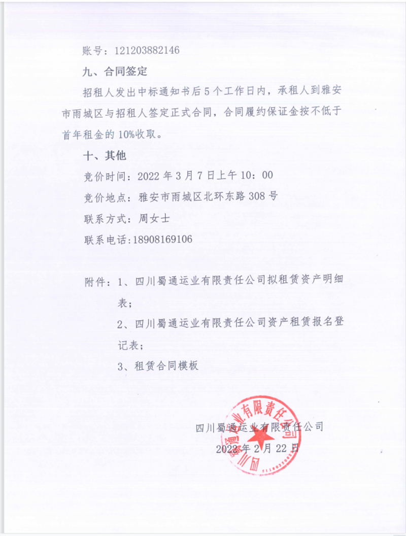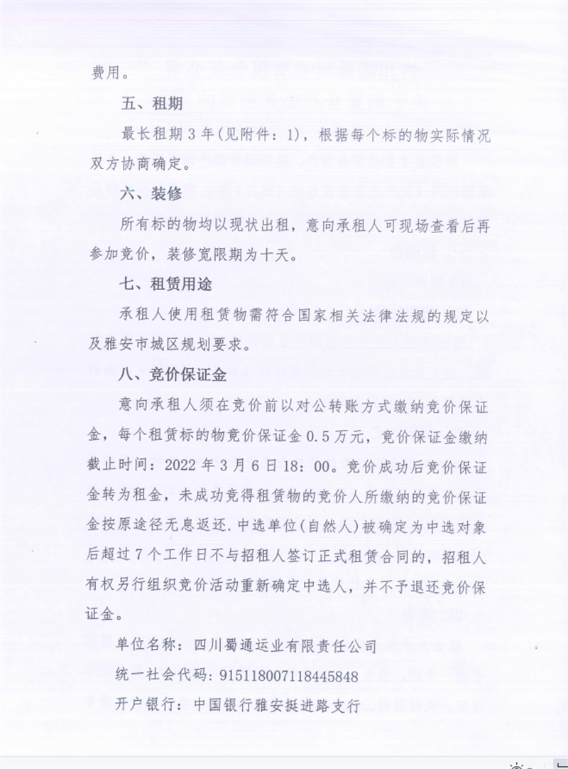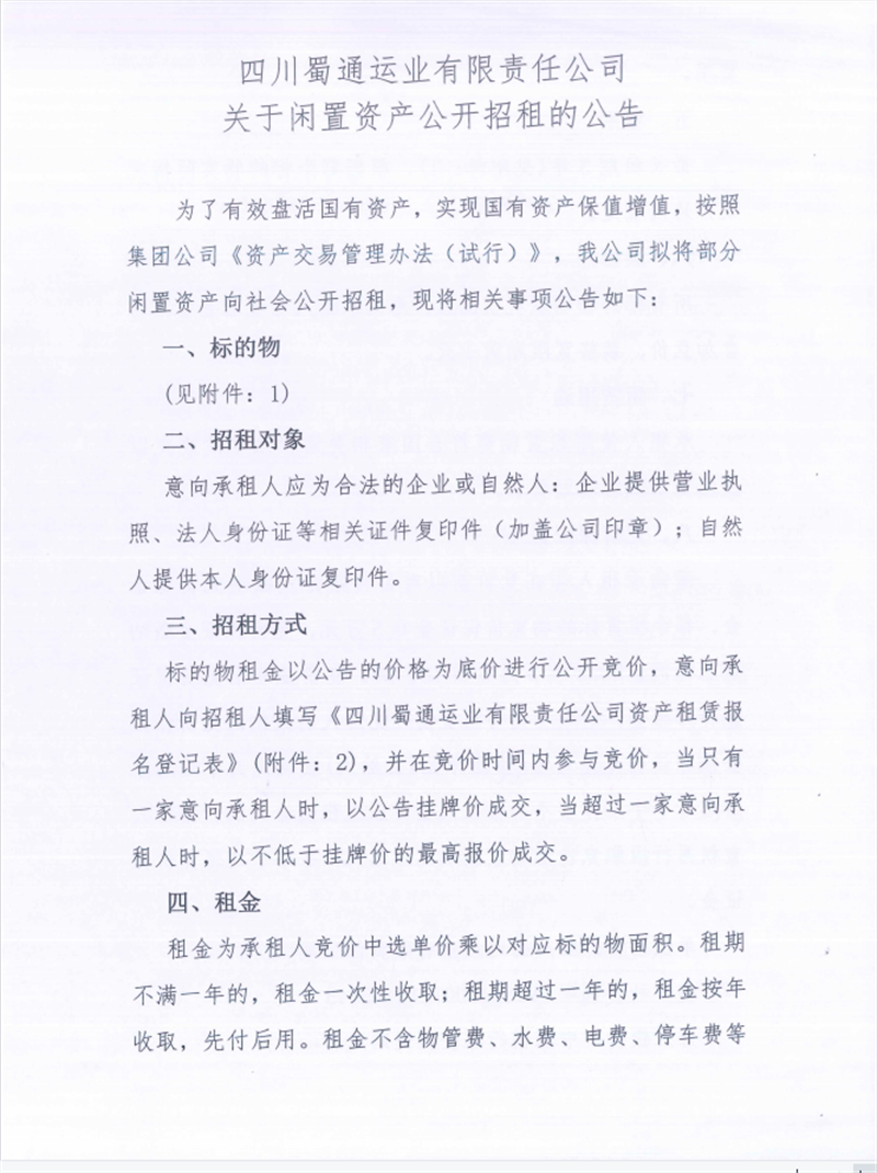 蜀通公司關(guān)于閑置資產(chǎn)掛網(wǎng)招租的公告