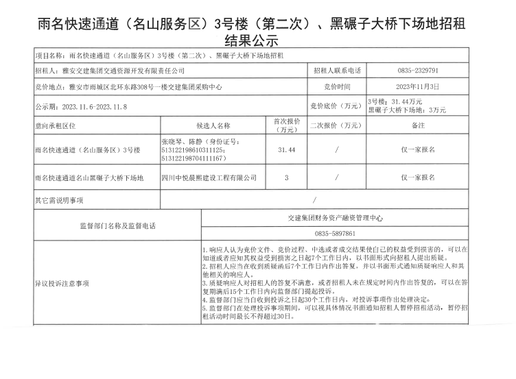 雅安交建集團(tuán)交通資源開(kāi)發(fā)有限責(zé)任公司雨名快速通道(名山服務(wù)區(qū))3號(hào)樓(第二次)黑碾子大橋下場(chǎng)地招租結(jié)果公示