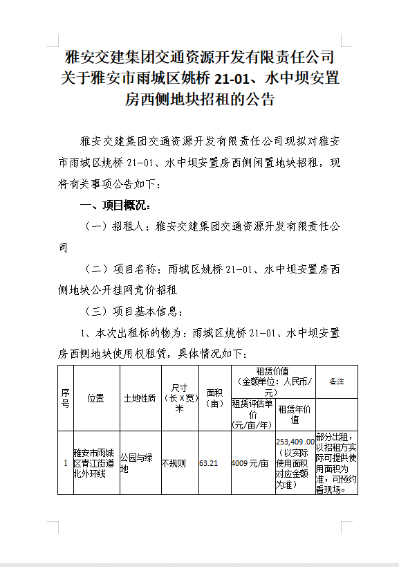 雅安交建集團交通資源開發(fā)有限責任公司關(guān)于雅安市雨城區(qū)姚橋21-01、水中壩安置房西側(cè)地塊招租的公告