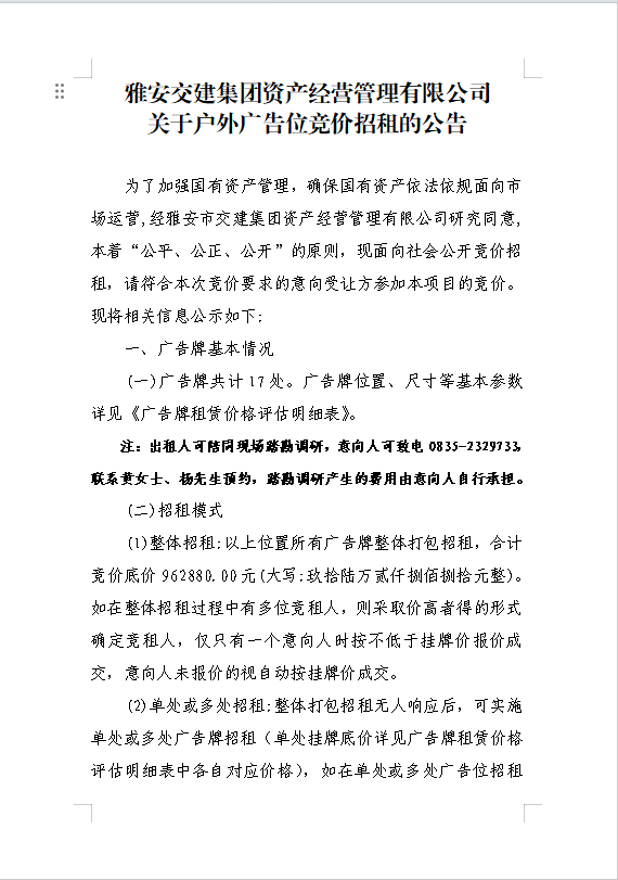 雅安交建集團(tuán)資產(chǎn)經(jīng)營(yíng)管理有限公司關(guān)于戶外廣告位競(jìng)價(jià)招租的公告附件