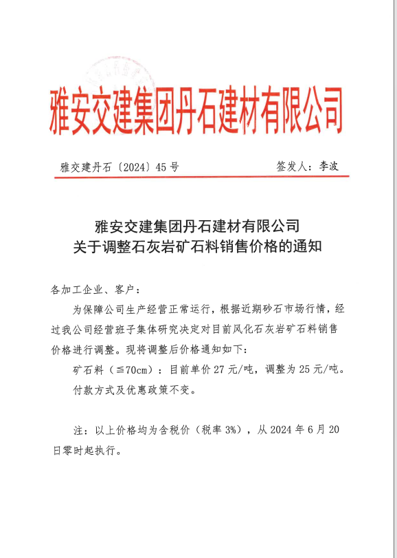 關于調(diào)整石灰?guī)r礦石料銷售價格的通知