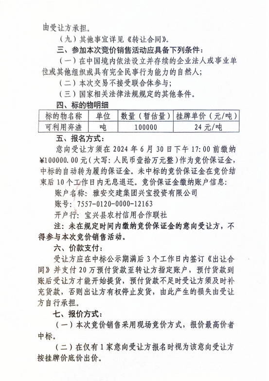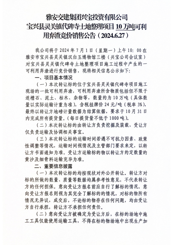 雅安交建集團興寶投資有限公司寶興縣靈關鎮(zhèn)代碑寺土地整理項目10萬噸可利用棄渣競價銷售公告(2024.6.27)