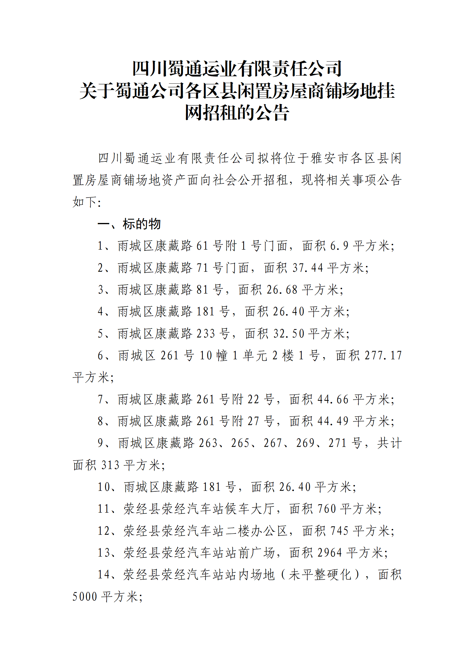 四川蜀通運(yùn)業(yè)有限責(zé)任公司關(guān)于蜀通公司各區(qū)縣閑置房屋商鋪場(chǎng)地掛網(wǎng)招租的公告