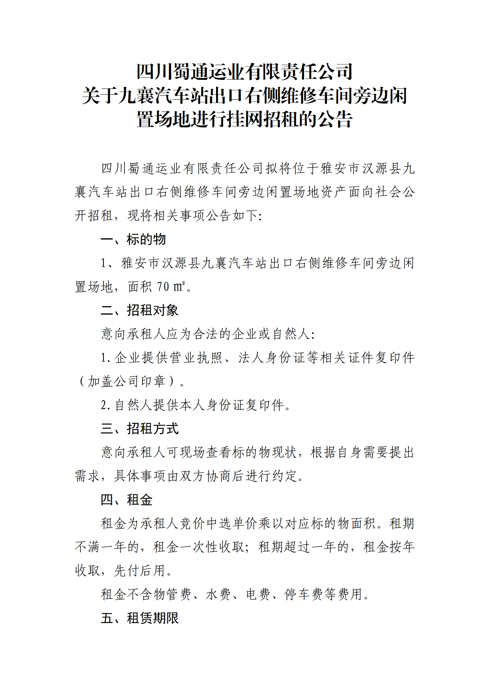 四川蜀通運(yùn)業(yè)有限責(zé)任公司 關(guān)于九襄汽車(chē)站出口右側(cè)維修車(chē)間旁邊閑置場(chǎng)地進(jìn)行掛網(wǎng)招租的公告