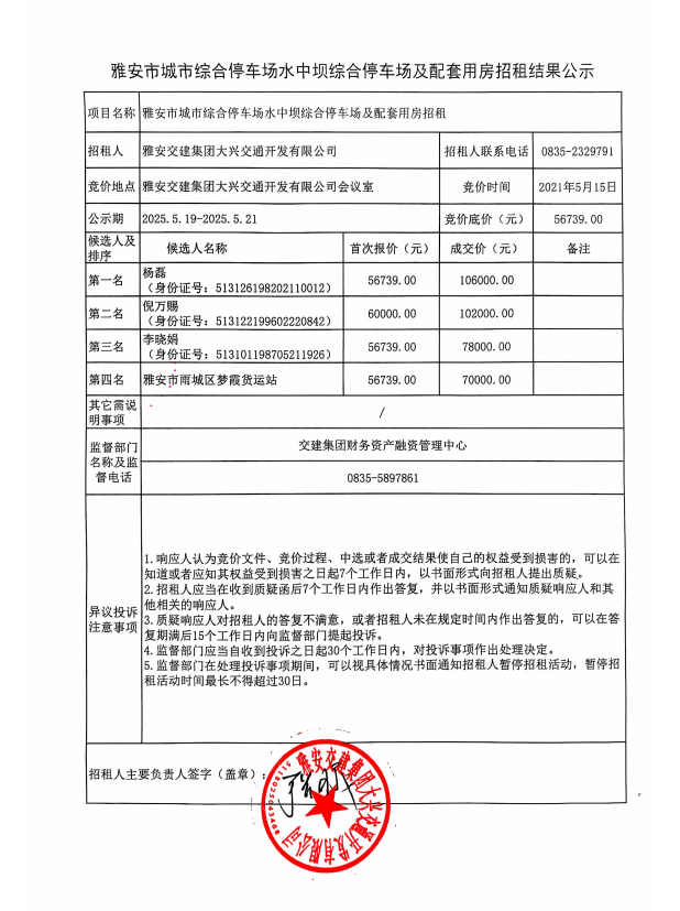 雅安市城市綜合停車場水中壩綜合停車場及配套用房招租結果公示
